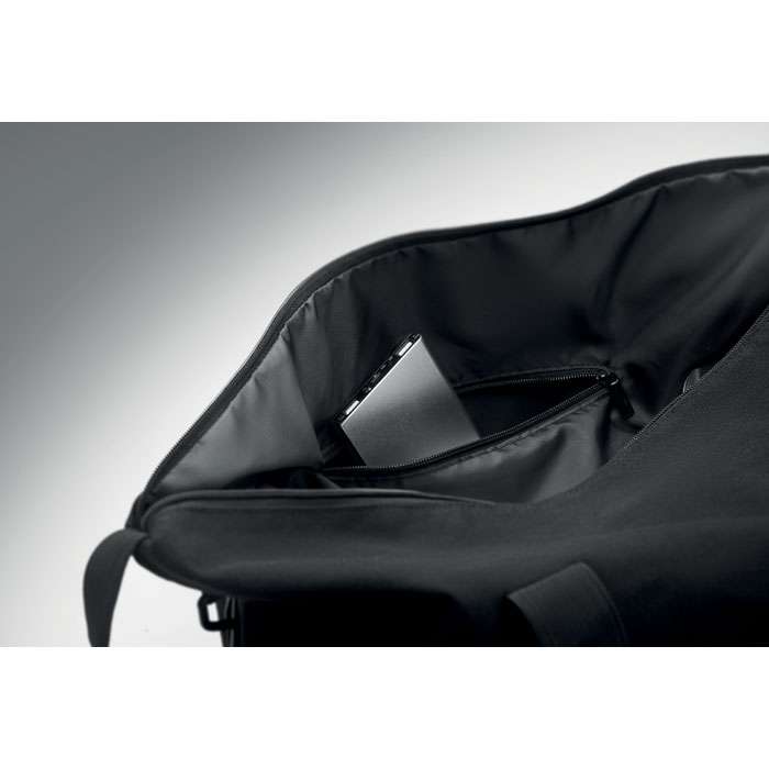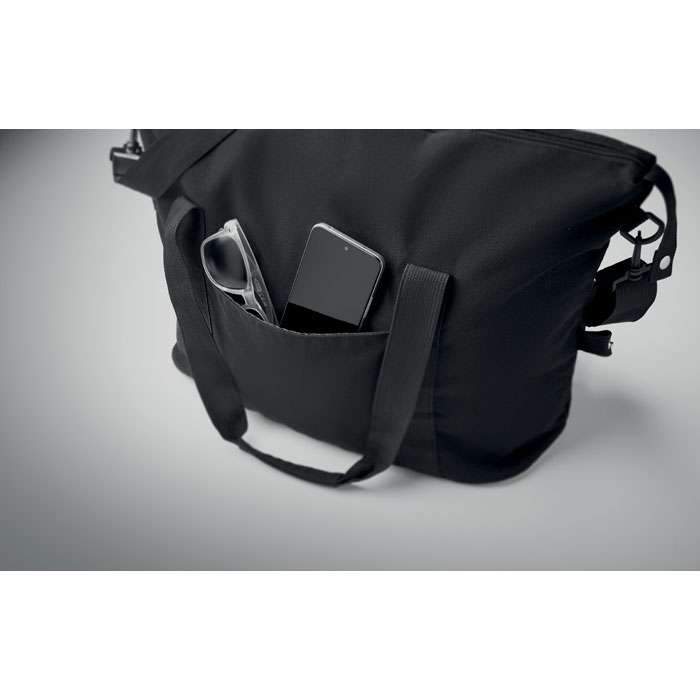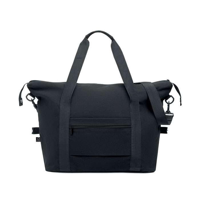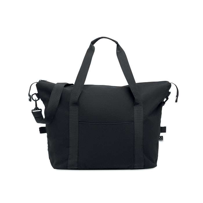Weekendbag i återvunnen bomull och återvunnen polyester (70%/30%) med foder i 210D RPET-polyester. Den har en ficka framtill, en bakficka med dragkedja, en avtagbar och justerbar axelrem och vadderad botten. Trolleyhållare på baksidan.