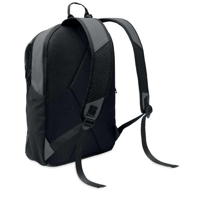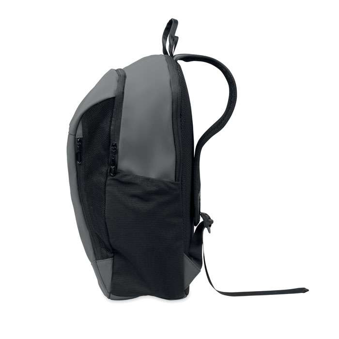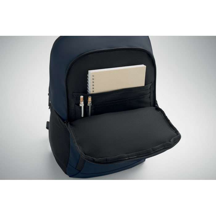 15 tums dataryggsäck i mjuk PU med vadderad rygg och dolt huvudfack med dragkedja. 1 framficka med dragkedja, 2 sidofickor med dragkedja och 2 sidofickor i elastiskt nät. Med foder i 210D RPET.