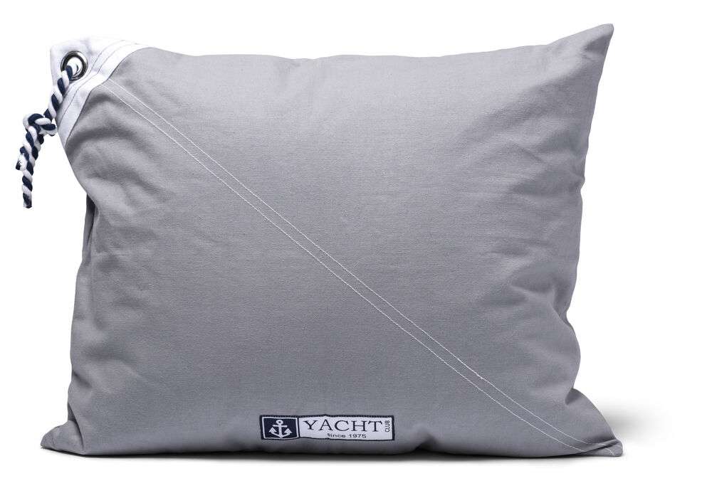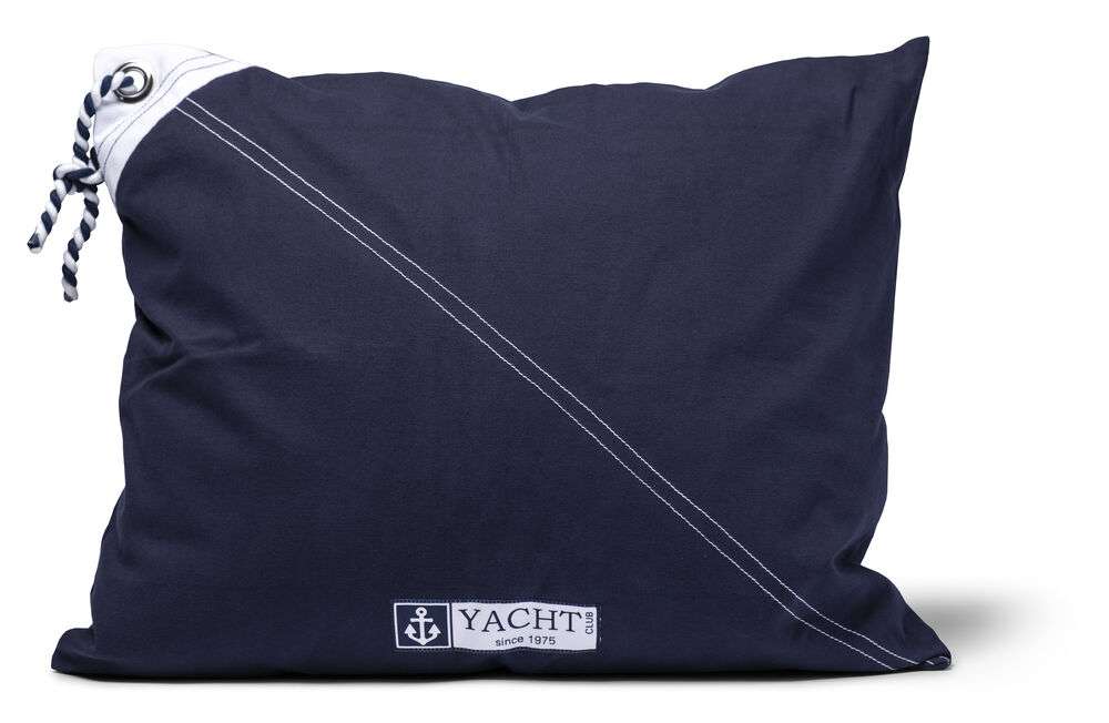 Kuddfodral med en diagonal söm samt en etikett påsydd.