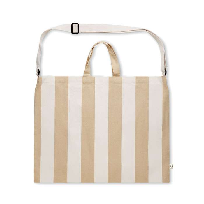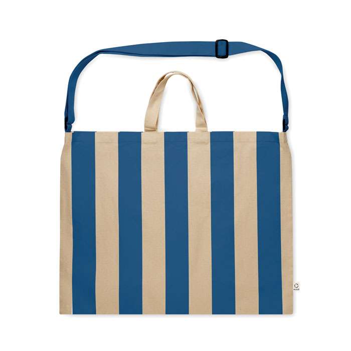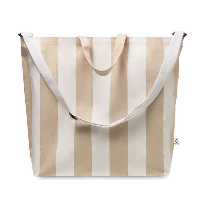 Extra stor randig strandväska i 280 gr/m² återvunnen bomull (80%) och återvunnen polyester (20%) med innerficka. Korta handtag och en stor, justerbar axelrem.