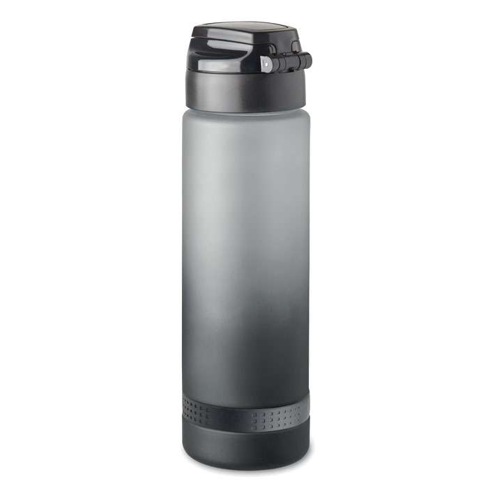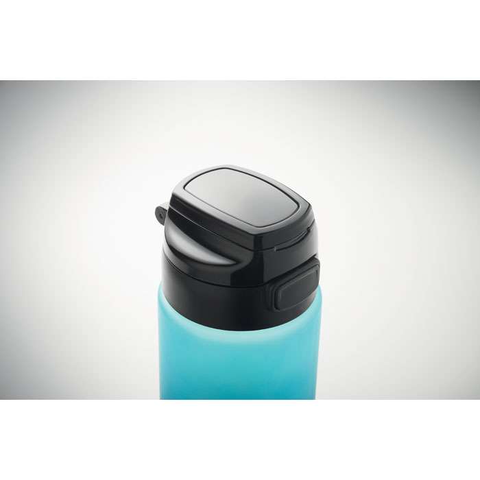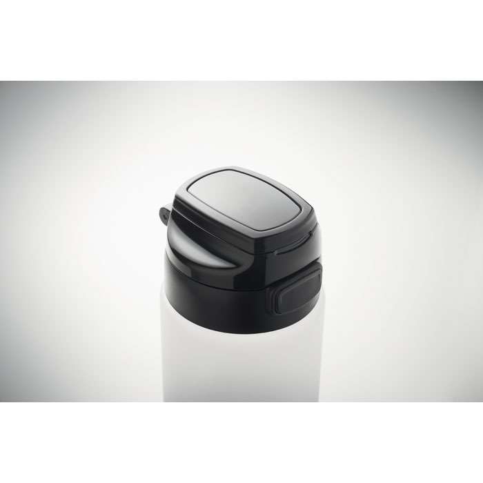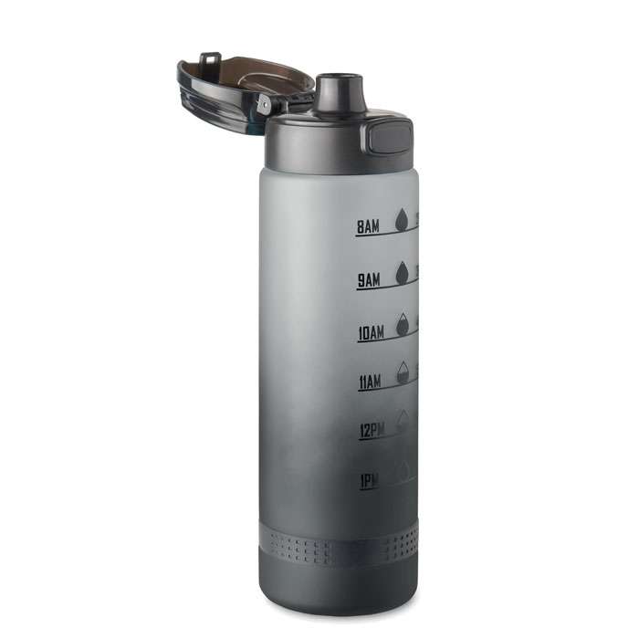 Sportvattenflaska i RPET, tidsmarkering, flip top-lock som kan öppnas med en hand, säkerhetslås och bärrem. Läcksäker. Volym: 1L.