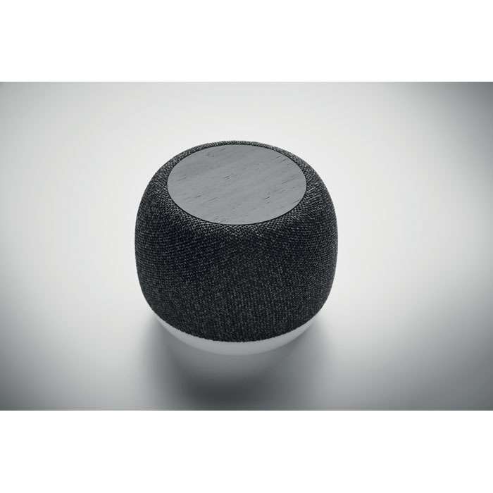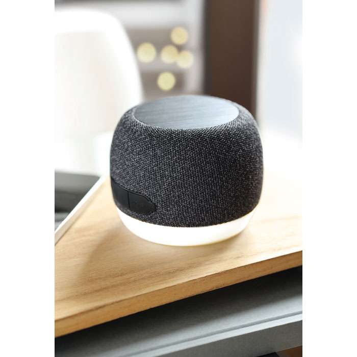5.0 trådlös högtalare och 15 W trådlös laddning i ABS och RPET-tyg och svartlackerad bambu på ovansidan med moodlight-bas. 1 uppladdningsbart Li-ION 1200 mAh batteri ingår. Inkluderar en SD-kortport och en AUX/ USB-kabel. Uteffekt: 5W, 3 Ohm och 5V. Speltid