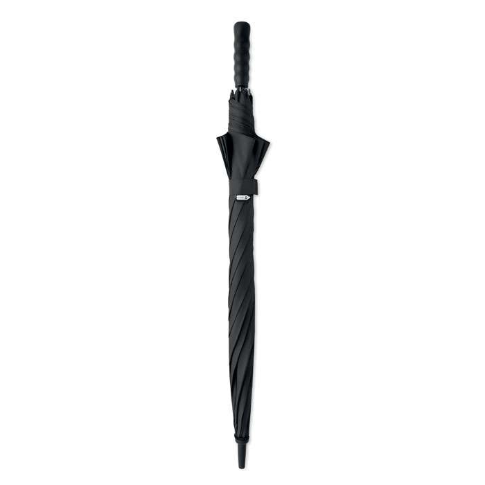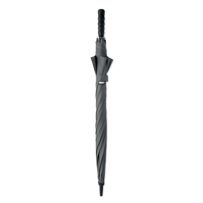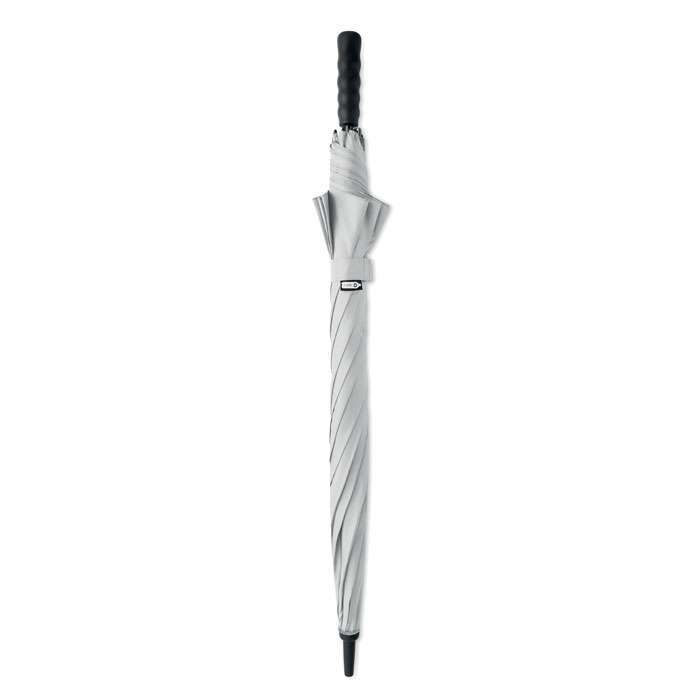 27 tums stormsäkert paraply med automatisk öppning i 190T RPET pongee. Skaft och ribbor av glasfiber. Handtag av vetestrå och återvunnet ABS. Tips och topp i plast.