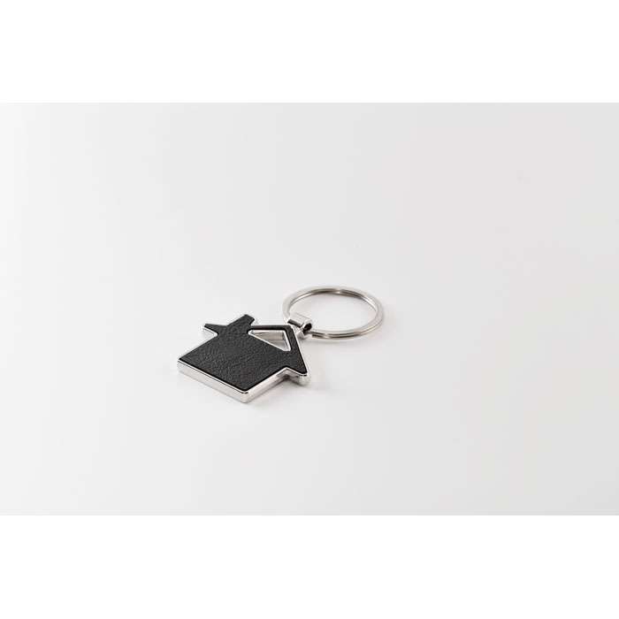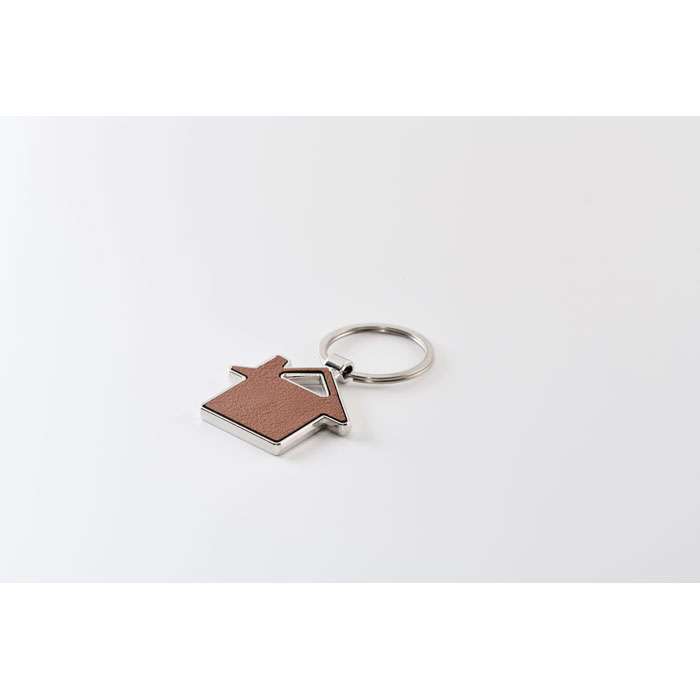 Husformad nyckelring i metall med inlägg av återvunnet PU-läder.