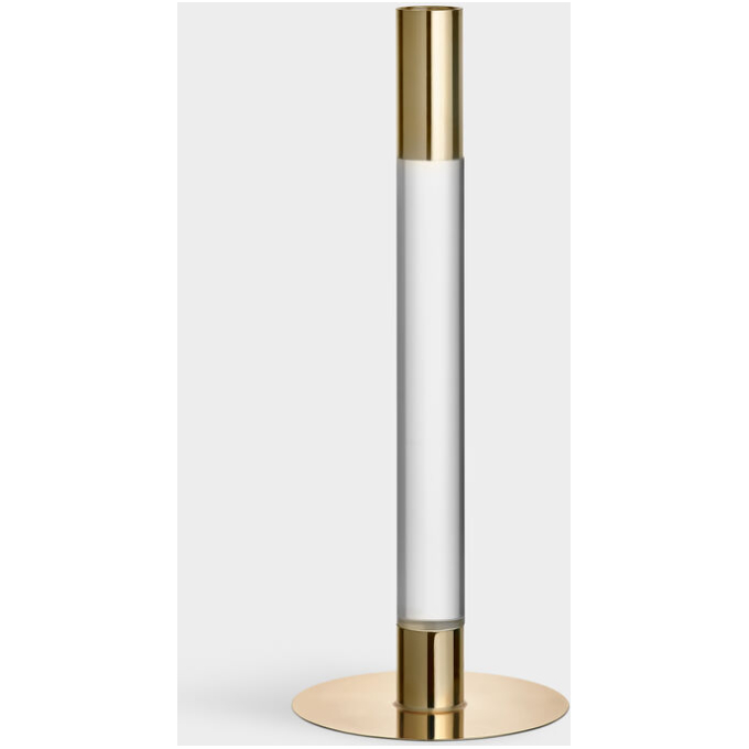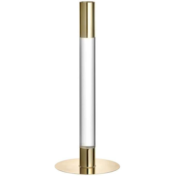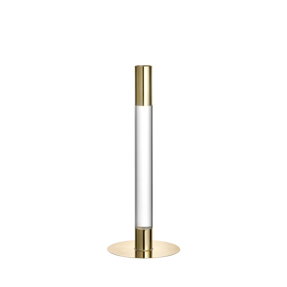 Lumiere från Orrefors är en serie ljusstakar där det kristallklara glaset och den spegelliknande metallen förenas i en form som är lika minimalistisk som slående. Ljusstaken (265 mm) i glas och guldfärgad metall förgyller sin plats var du än placerar den. Formgiven av Ingegerd Råman 2021.