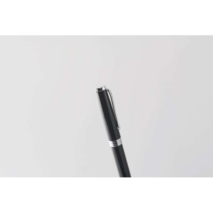 Kulspetspenna med vridfunktion och skaft i återvunnet rostfritt stål. Blått bläck. Levereras i svart låda.