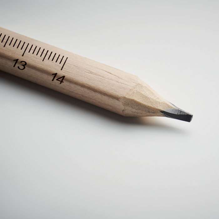Snickar penna i trä med 14 cm linjal förtryckt på pennan.