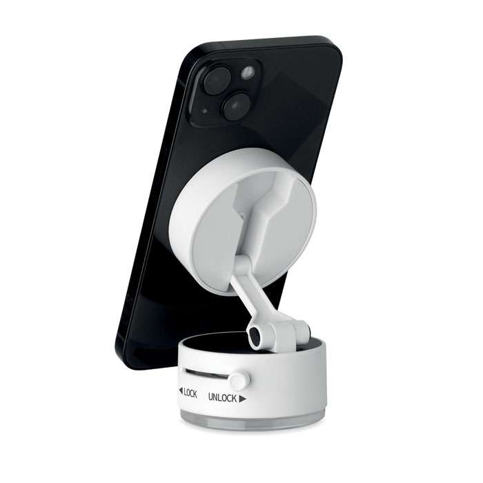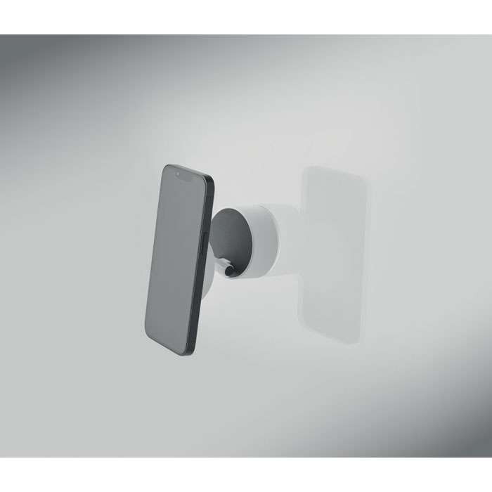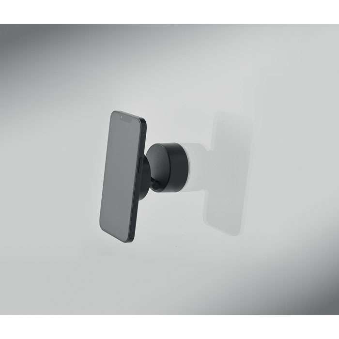 Magnetisk telefonhållare i ABS. Vakuumsugande hållare. Kompatibel med iPhone® 12 och nyare. Inklusive extra magnetisk metallring för att stödja laddning av andra icke-magnetiska trådlösa laddningsbara telefoner.