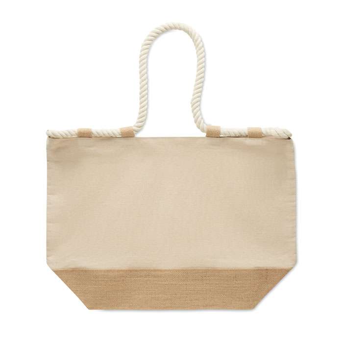 Strandväska i 280 gr/m² bomullscanvas i sidorna och botten i jute samt stägning med dragkedja. Rephandtag som fästs i 10st små jute öglor.
