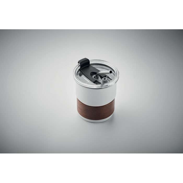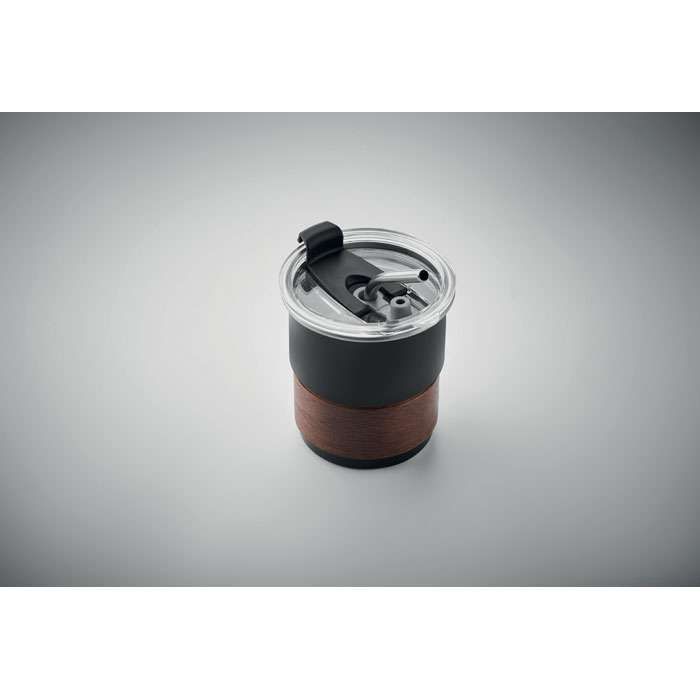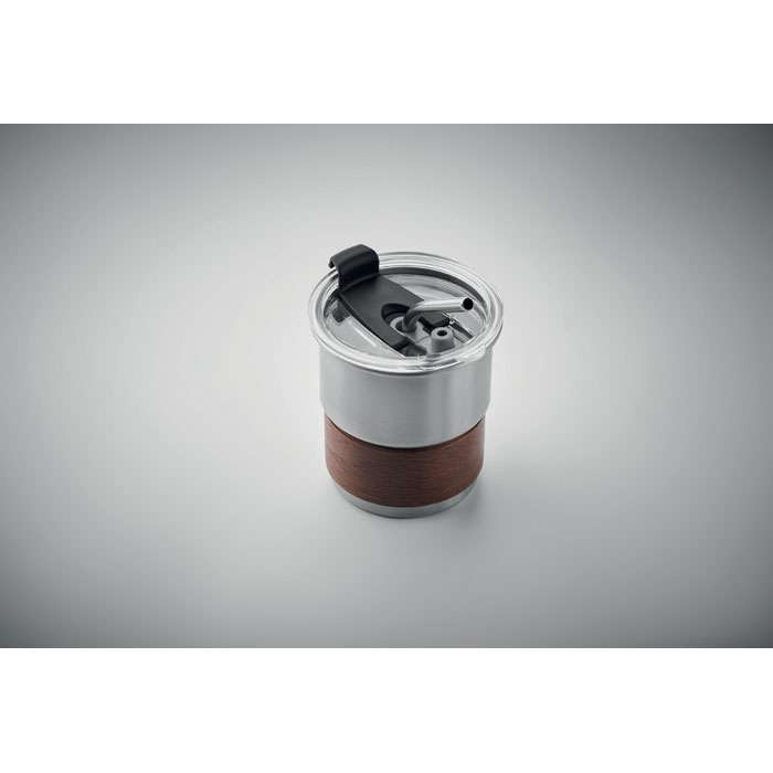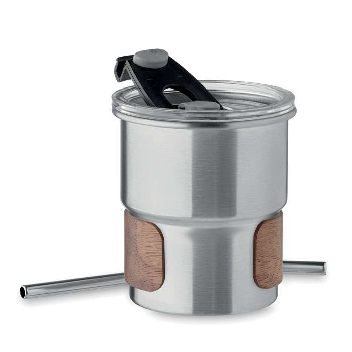 Enkelväggig kopp i återvunnet rostfritt stål (90% återvunnet rostfritt stål och 10% rostfritt stål) med avtagbart grepp i akaciaträ, sugrör i rostfritt stål. Lock med hål för sugrör och dricköppning, läckagesäkert. Volym: 260 ml. Silikongreppet ger dig ett bra grepp och skyddar dina händer från att bränna sig.