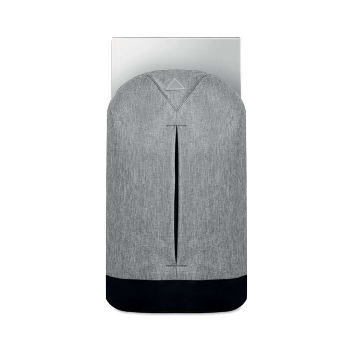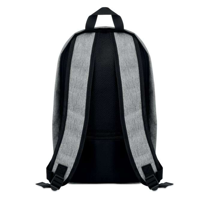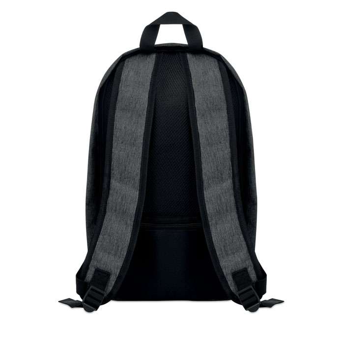 Ryggsäck i 600D duotons polyester med en vertikal frontficka med blixtlås. Datorfack som passar datorer upp till 13” dator.