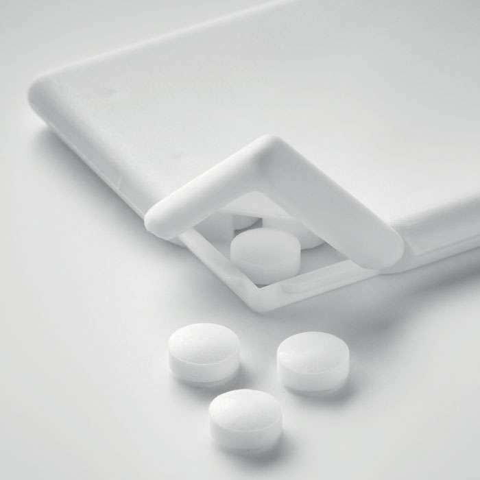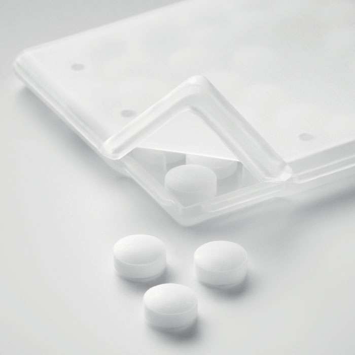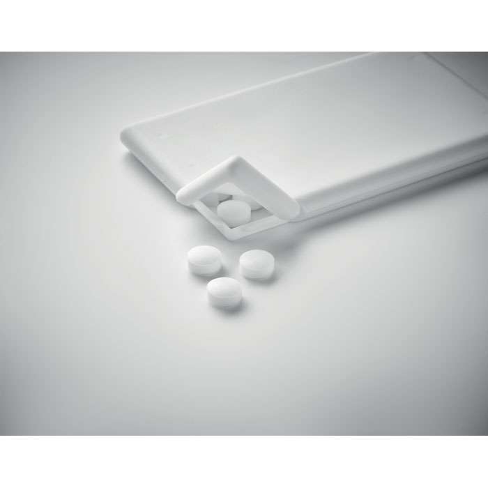 Minttabletter i en behållare lika stort som ett kreditkort. Innehåller 8 gram minttabletter.
