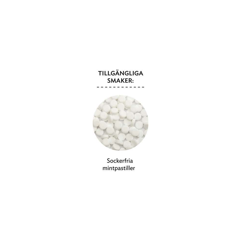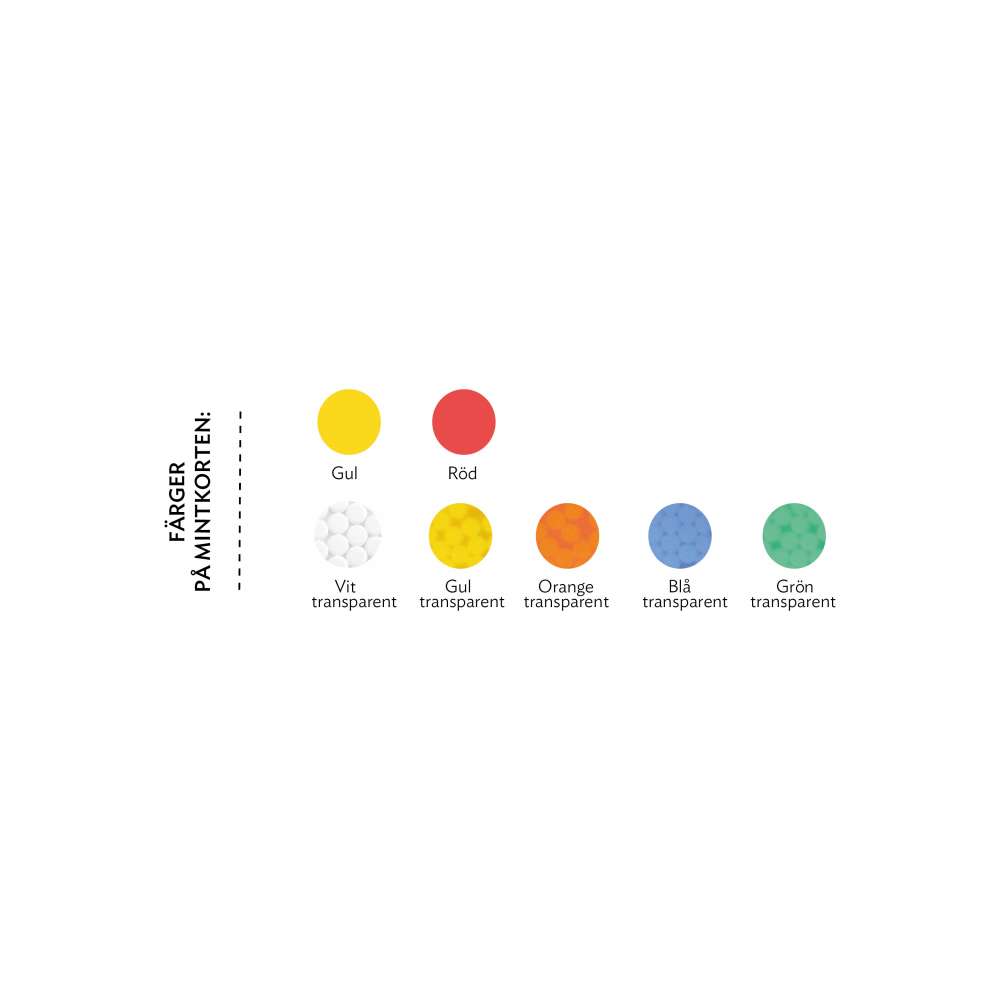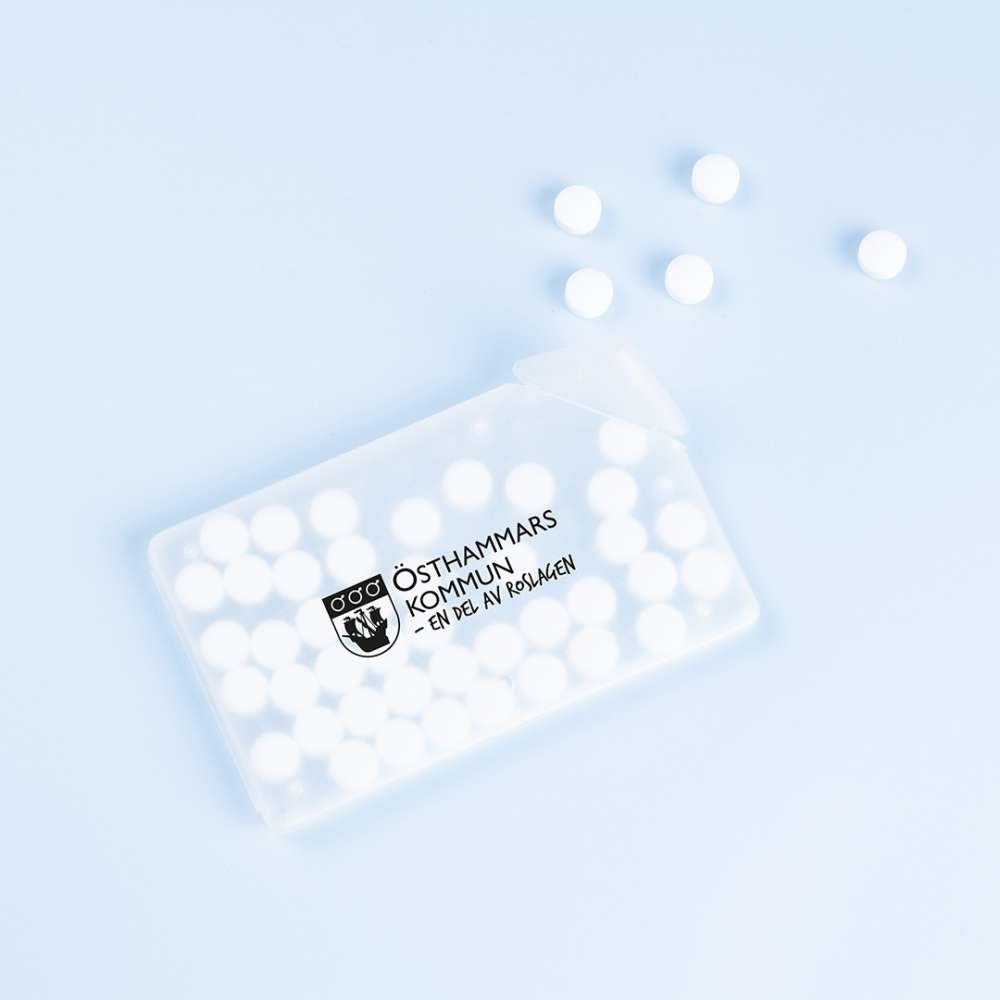 Praktiska plastkort i kreditkortsstorlek fyllda med cirka 50 st sockerfria mintpastiller. Goda tryckmöjligheter då korten digitaltrycks. Finns i flera olika färger.