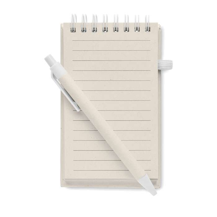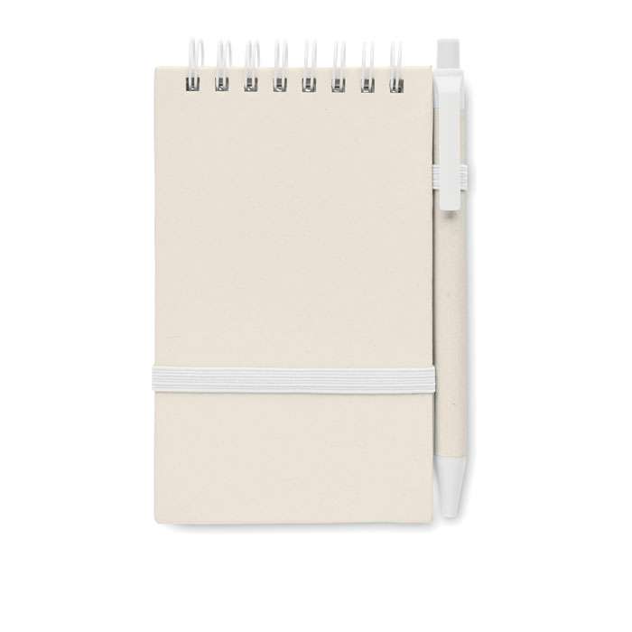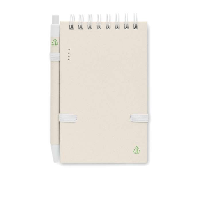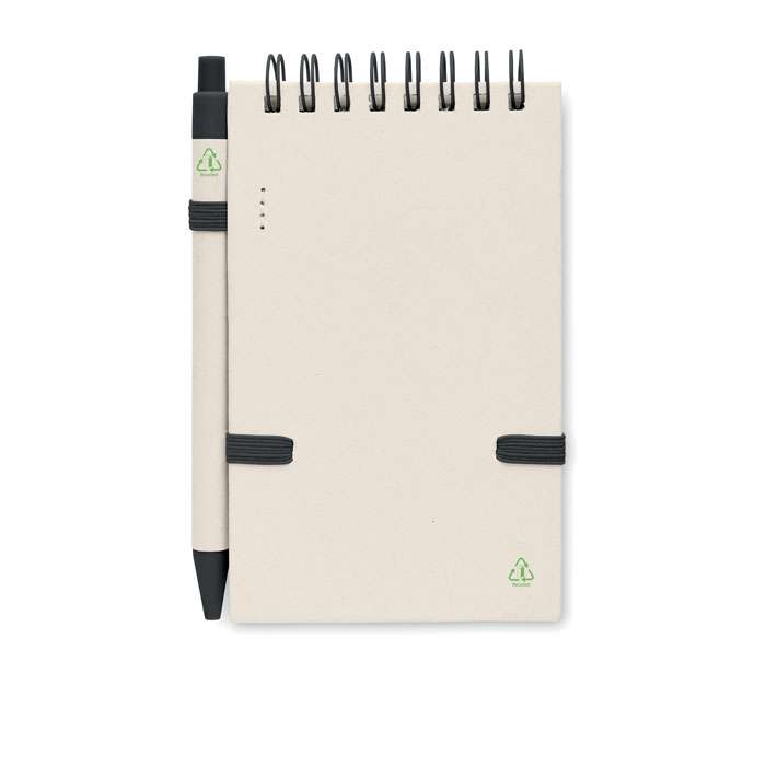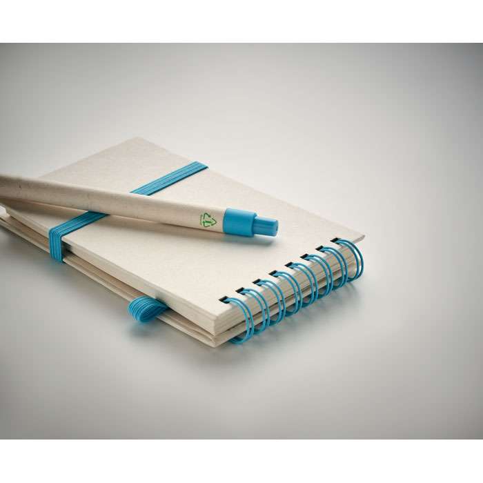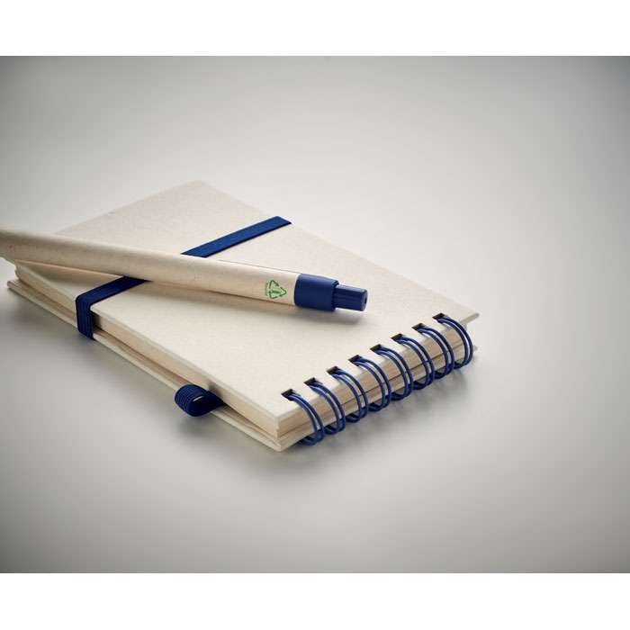 A6 anteckningsbok med blanka papper med 70 ark (70 % återvunnen mjölkkartong och 30 % återvunnet papper) med matchande penna. Ringbunden. Matchande kulspetspenna med tryckknapp. Blått bläck. Elastiskt band och pennhållare.