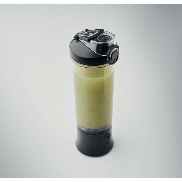 Bärbar mixerkopp i PCTG med PP-lock, extra drickslock och bärögla. Har en motor på 18000 rpm, ett uppladdningsbart batteri på 1200 mAh och en Type-C till USB-A-kabel. Kapacitet: 600ml.