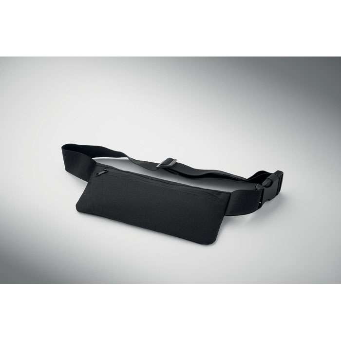 Midjeväska för löpning tillverkad av 600D RPET-polyester med PU-baksida. Har ett huvudfack med dragkedja, sidoficka med dragkedja och justerbar elastisk rem. Lätt och tålig.