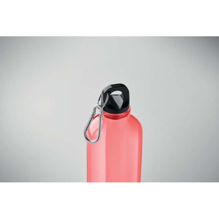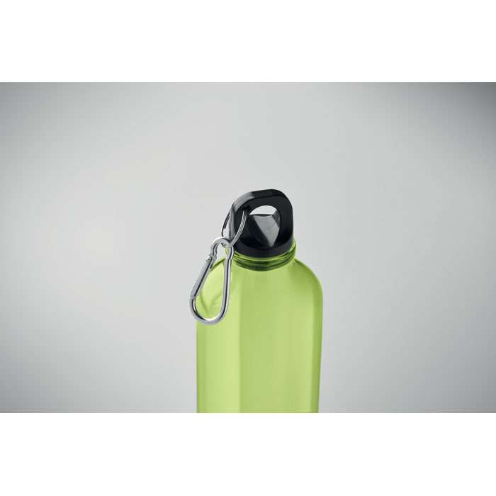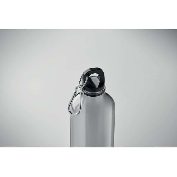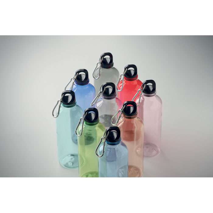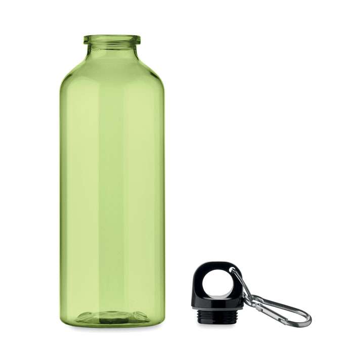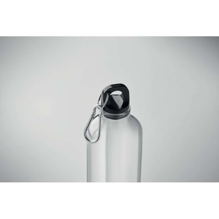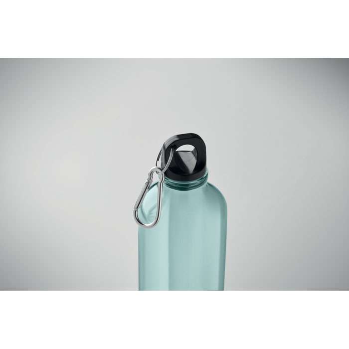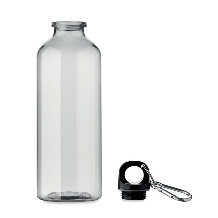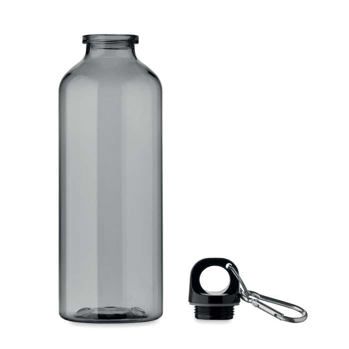 Vattenflaska i RPET med svart skruvkork och karbinhake för att enkelt kunna fästas på ryggsäck eller hängas upp. Volym: 500 ml.