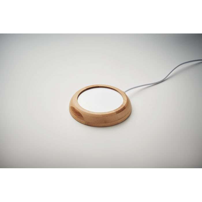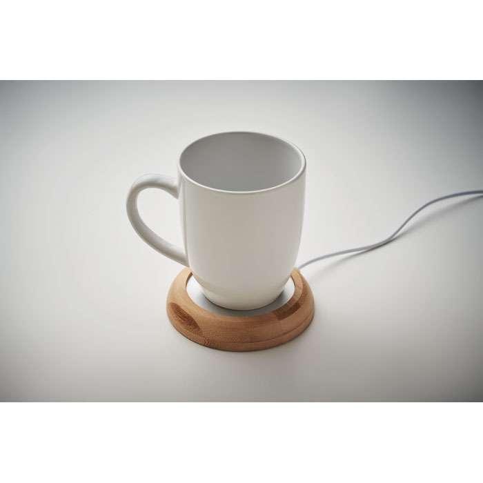 Muggvärmare i bambu. Håller drycker varma upp till max 45ºC. Den har en USB-anslutningskabel.