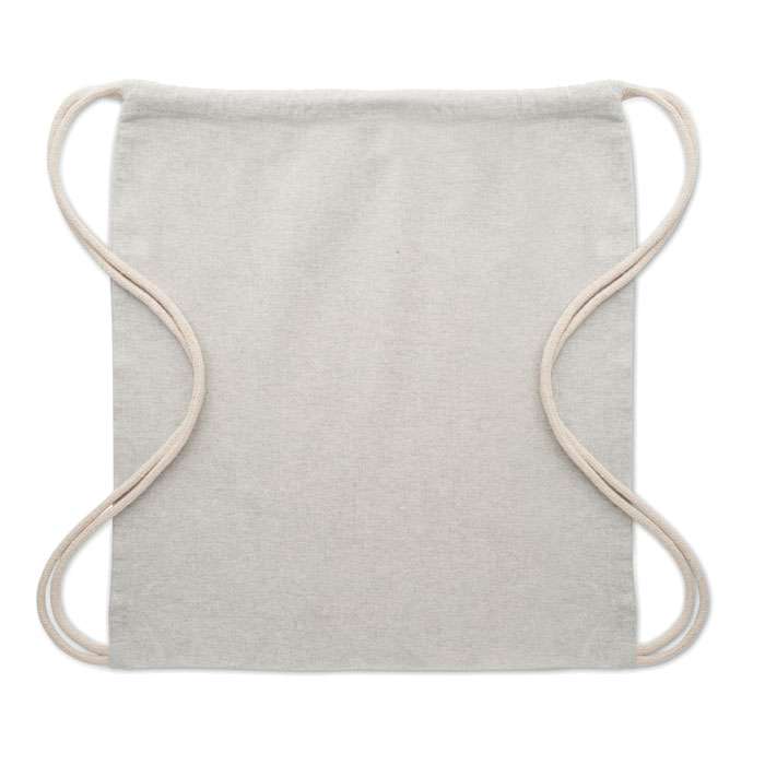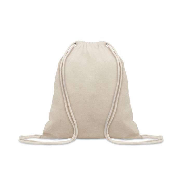 Påse med dragsko i återvunnen bomull (80 % återvunnen bomull, 20 % vanlig bomull). 140 gr/m².