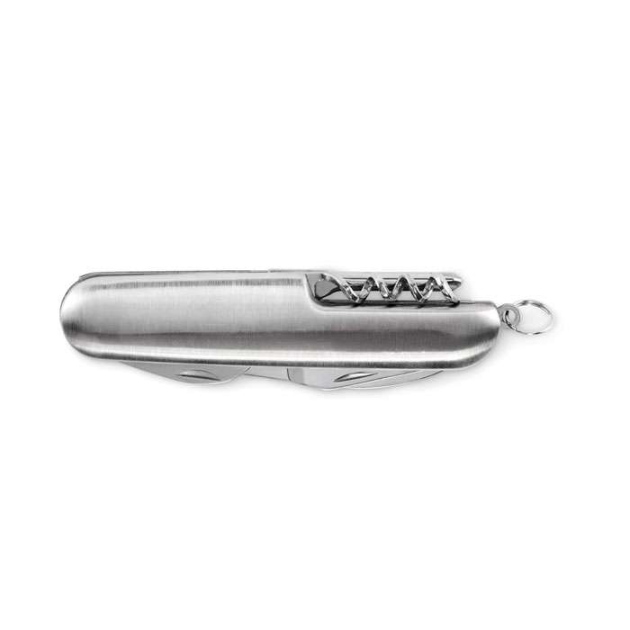 Fickkniv med flera funktioner i återvunnet aluminium. 5 funktioner: Knivblad, kapsylöppnare, skruvmejsel, korkskruv och burköppnare.