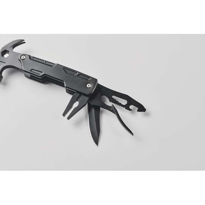14-i-1 multiverktygshammare i rostfritt stål. Med spikavdragare, insexnyckel, tandad kniv, stålfil, olika skruvmejslar, vanlig tång, spetsig tång, flasköppnare, kniv, avbitartång.