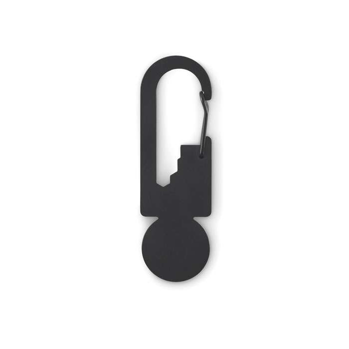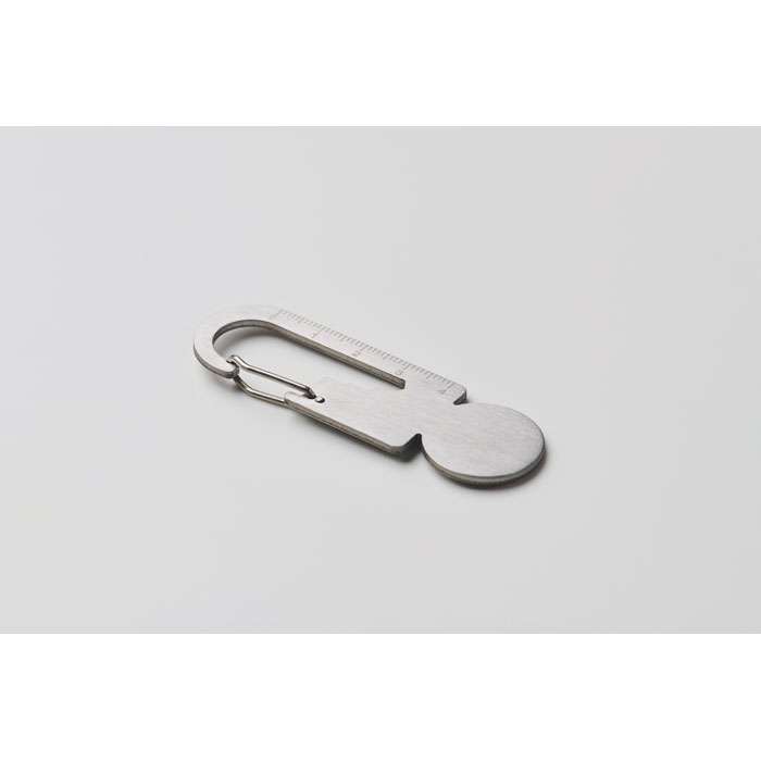 Nyckelring med 1€ kundvagnsmynt i återvunnet rostfritt stål (90% återvunnet och 10% rostfritt stål) med ett multifunktionsverktyg som inkluderar flasköppnare, linjal och sexkantsnyckel 5,5 mm, 7 mm och 8 mm.