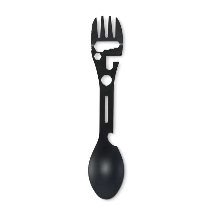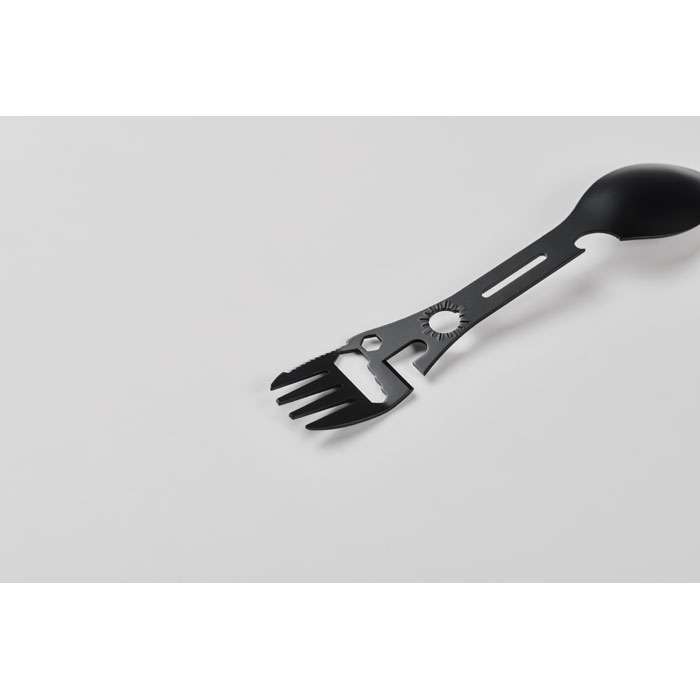 Multiverktygsbestick i rostfritt stål. Verktygen inkluderar sked, gaffel, justerbar skiftnyckel, kapsylöppnare, sexkantsnyckel, tandad kniv, öppnare och positioneringsnyckel.