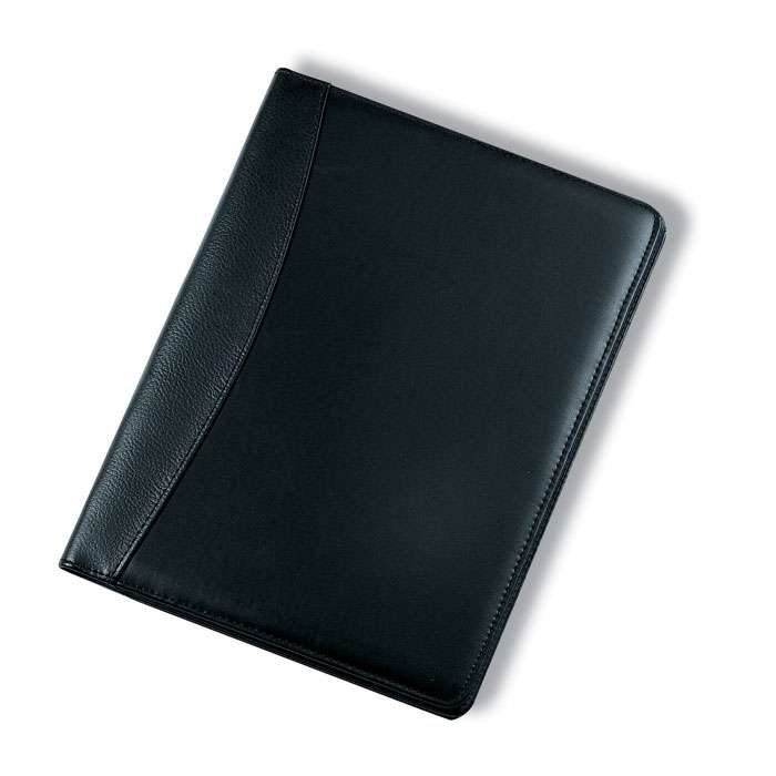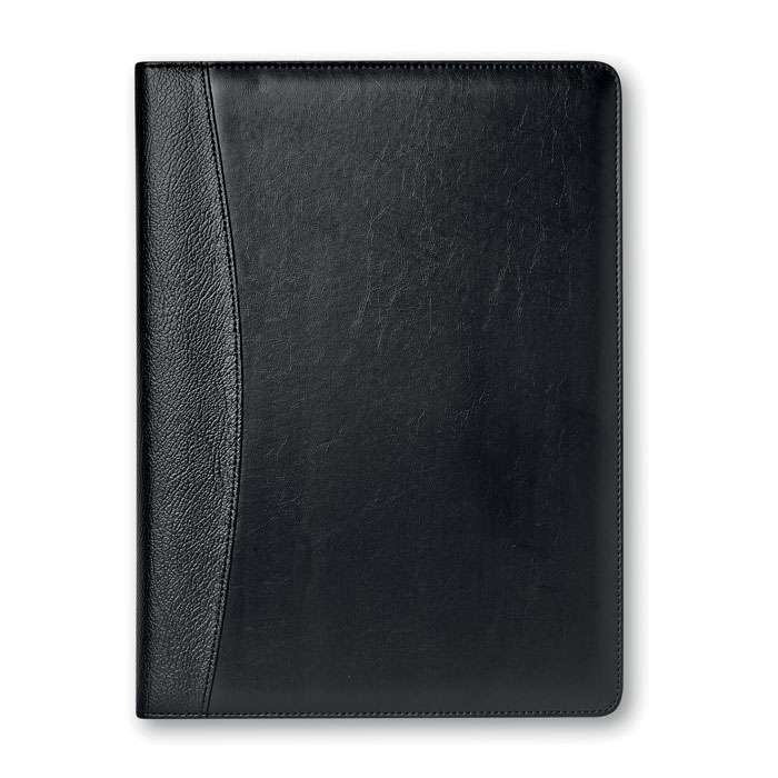 A4 konferensmapp i imitationsläder med solenergi miniräknare, kulpenna med blått bläck och 20 sidigt linjerat anteckningsblock.
