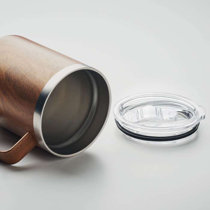 Dubbelväggig mugg i återvunnet rostfritt stål (90 % återvunnet rostfritt och stål 10 % rostfritt stål) med träutseende och skjutbart lock med sipphål. Volym: 300 ml.