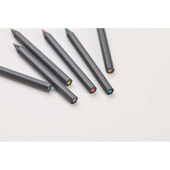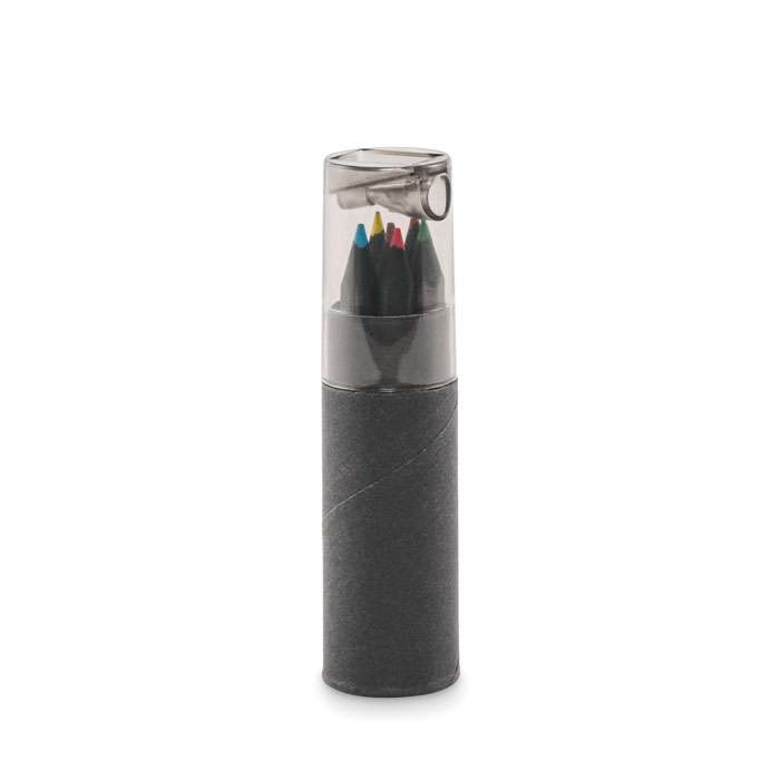 Svartfärgad papperbehållare som innehåller 6 färgpennor och en pennvässare i locket på lådan.