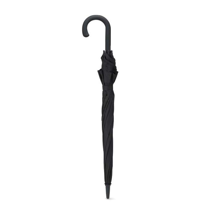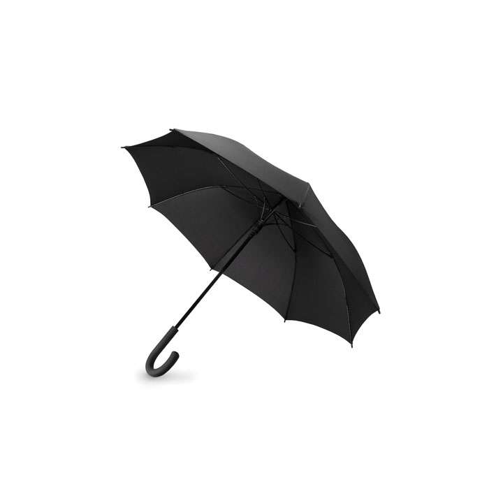 Stormparaply ”De luxe” 23 tum i exklusivt 190T pongee material med svart pläterat metalllskaft, svart fiberglas i spröt och svarta plastspetsar. Svart böjt gummerat handtag i ABS med grå knapp för automatisk öppning. Manuel stängning.