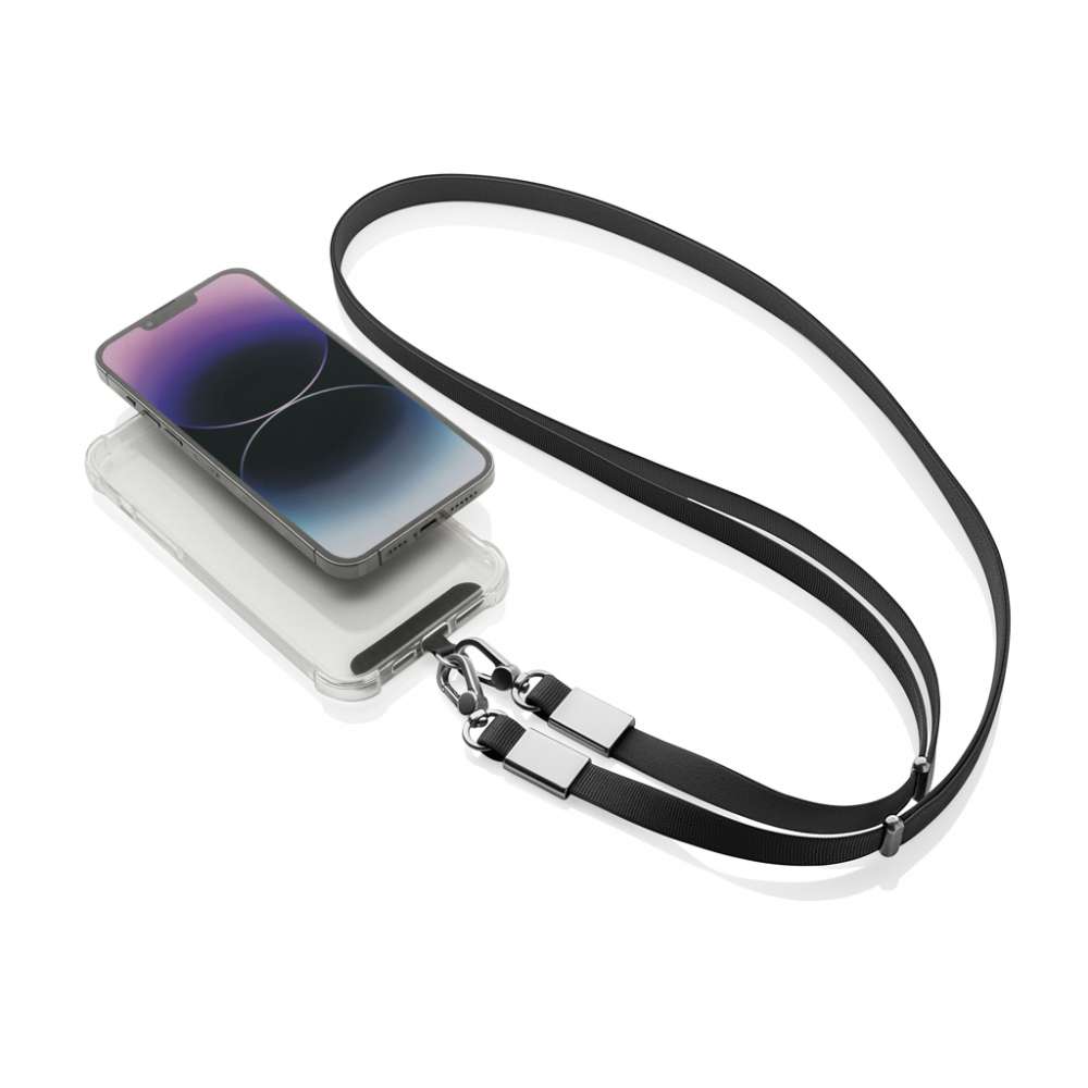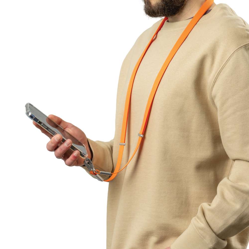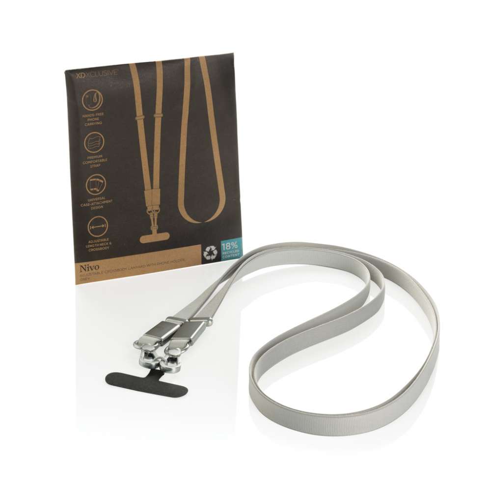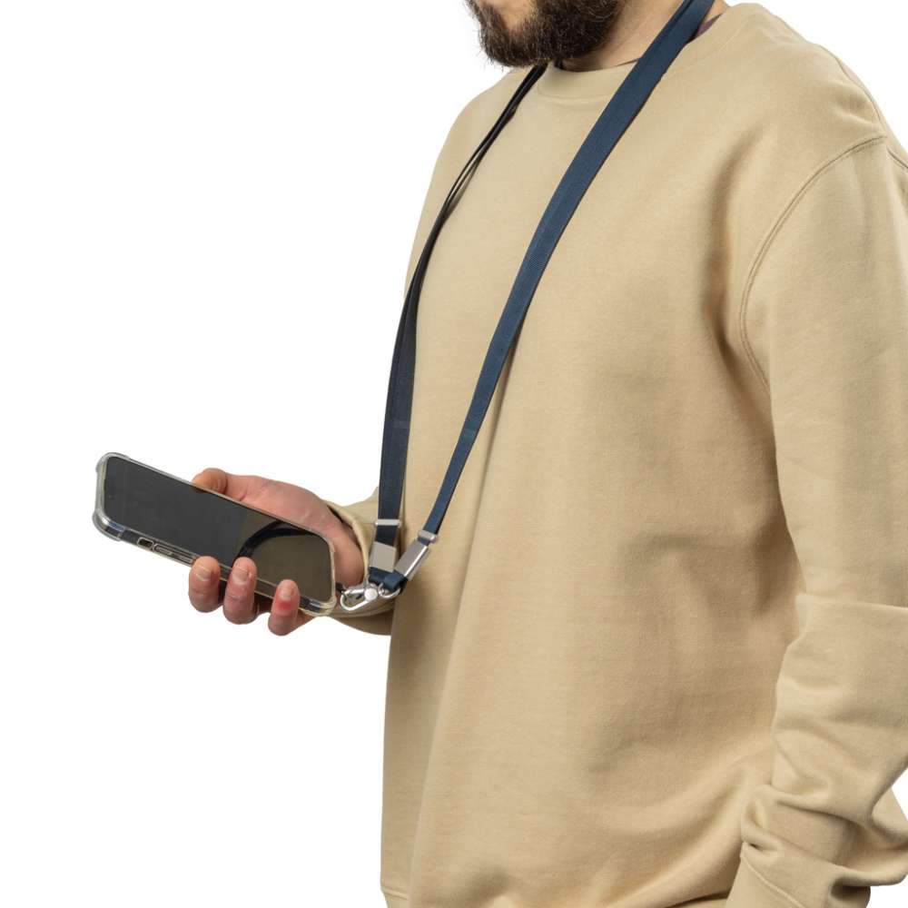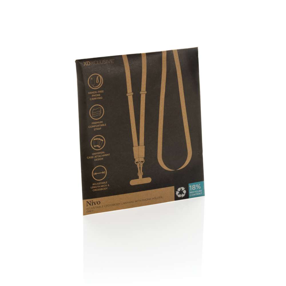 Nivo är ett universellt axelband för telefonen, utformat för att hålla din enhet säker och inom räckhåll. Tillverkat av återvunnen PET med detaljer i premiumaluminium, kombinerar Nivo hållbarhet med ett rent, modernt utseende. Det tjocka, högkvalitativa bandet är utformat för maximal bärkomfort, idealiskt för daglig användning. Dess universella och starka design fungerar med alla telefoner som använder ett skyddande fodral, så att du kan bära din enhet säkert utan att begränsa funktionaliteten. Nivo kan bäras bekvämt runt halsen eller som axelband, vilket ger dig fullständig handsfree-bekvämlighet vart du än går. Det justerbara bandet kan enkelt ställas in från 200 cm till 120 cm, vilket säkerställer en perfekt passform för alla användare och bärstilar. Tillverkad med RCS (Recycled Claim Standard)-certifierad återvunnen PET och återvunnet aluminium. Det totala återvunna innehållet är 18 % baserat på den totala vikten på produkten. PVC-fri och förpackad i plastfri FSC-förpackning.