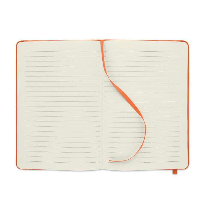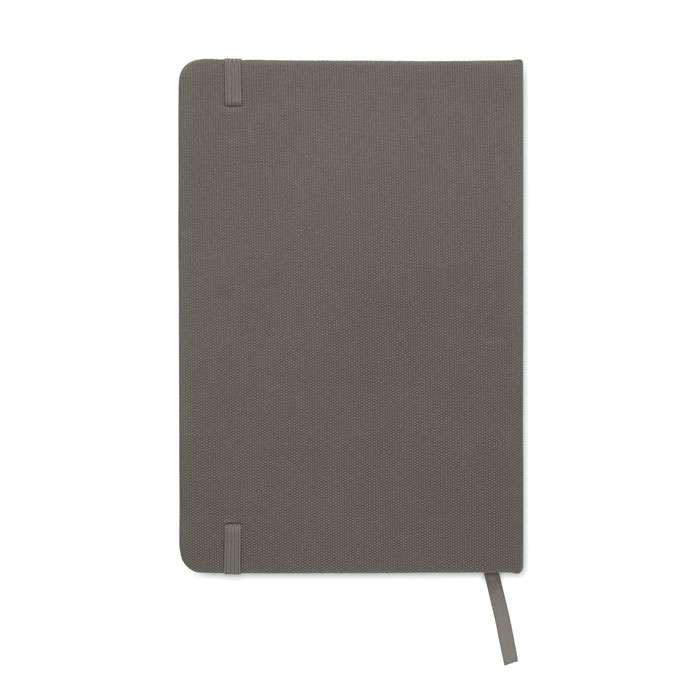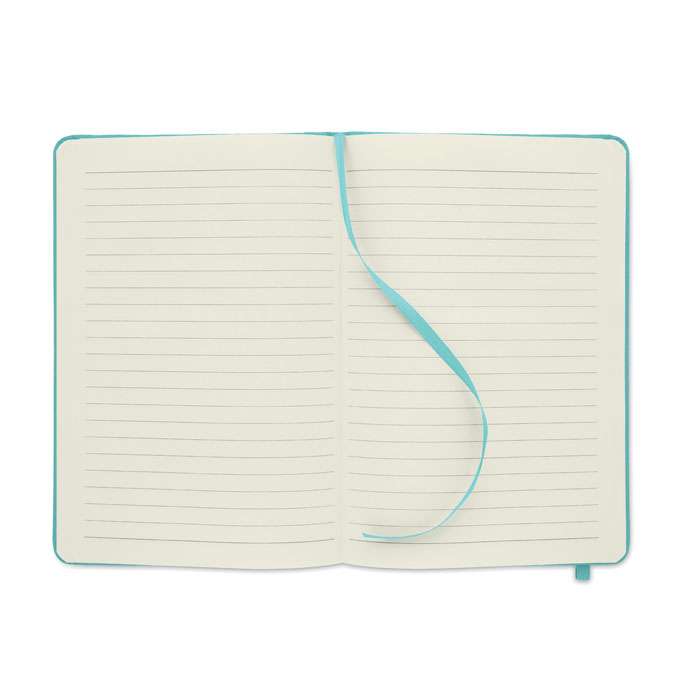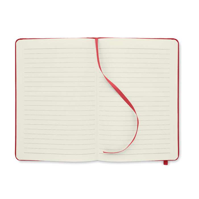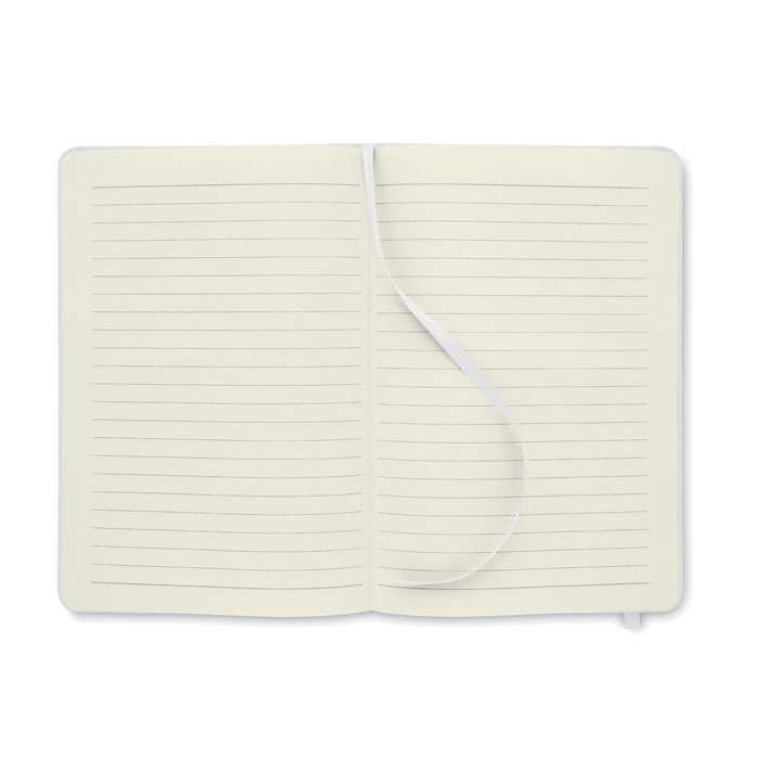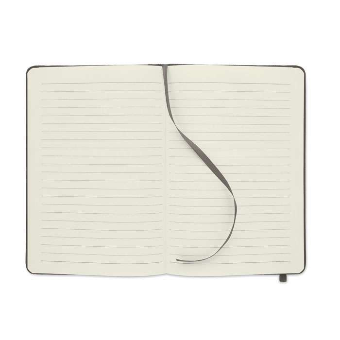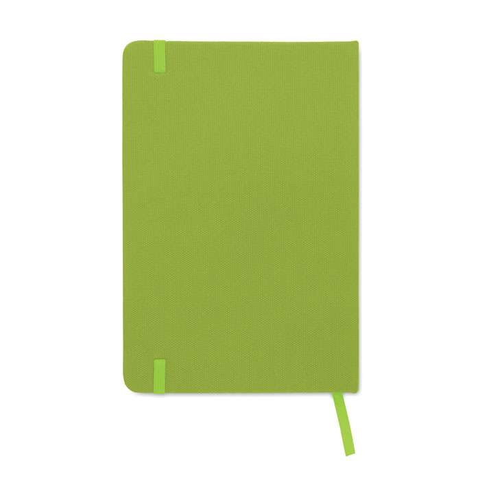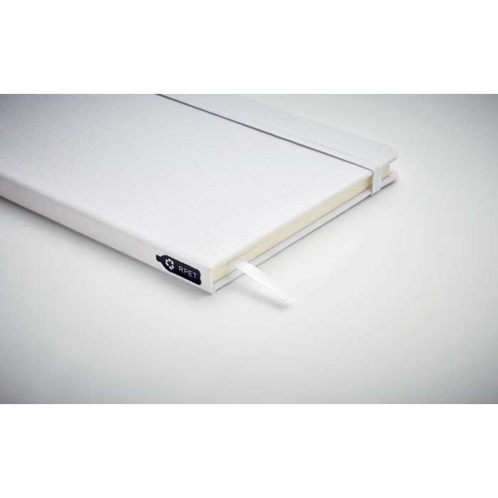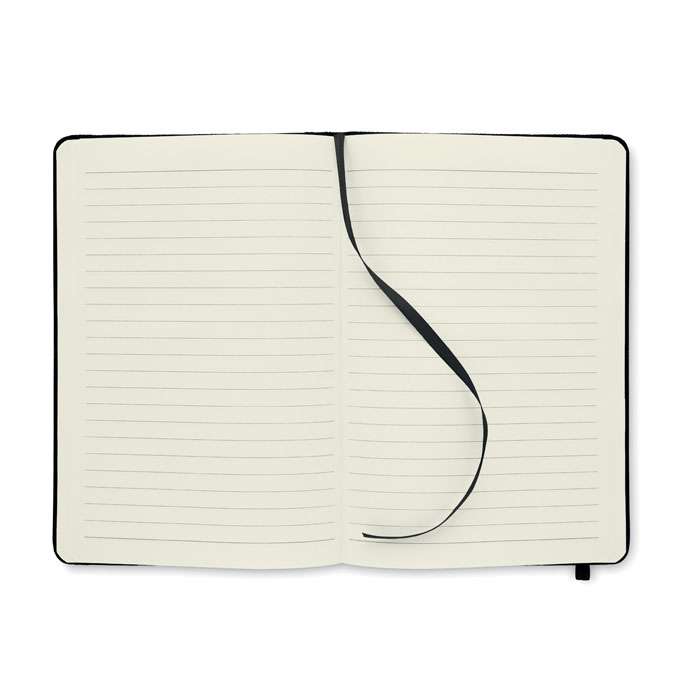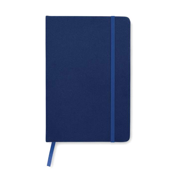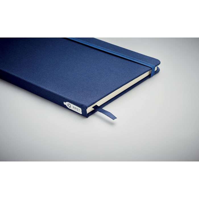 A5 anteckningsbok med 600D RPET hårt omslag och 80 linjerade sidor i återvunnet papper med ett elastiskt band och läsband. FSC®-certified | FSC MIX CREDIT, P7.1, FSC-C213206