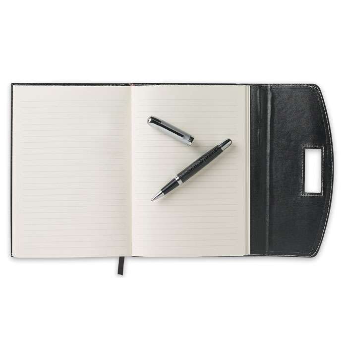 A5 portfölj med kontrastsömmar. Med 120 sidigt linjerat block och metall penna. PU material. Svart bläck.