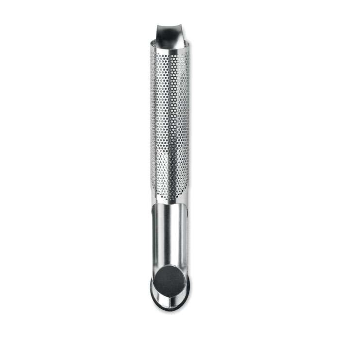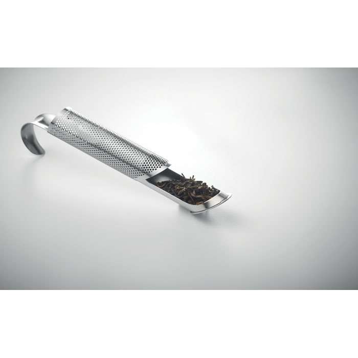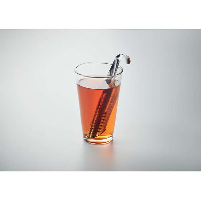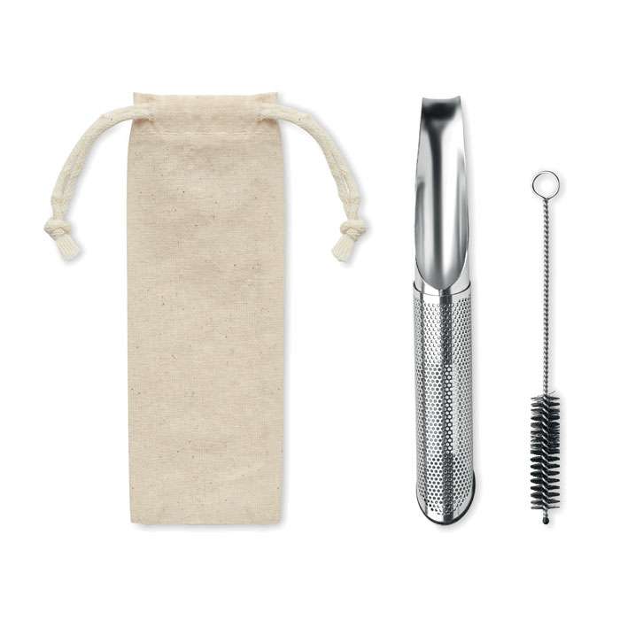 Tesil i rostfritt stål i bomullspåse. Kompakt med böjd krok så att det kan hänga över kanten på koppen och rengöringsborste.