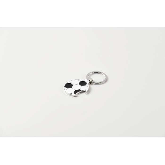 Fotbollsformad nyckelring med flasköppnare av zinklegering med järnring.