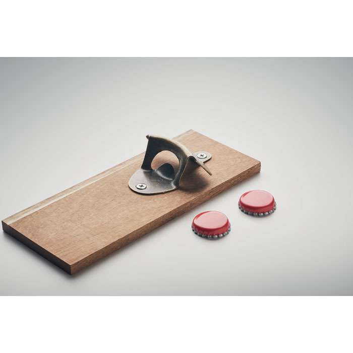 Väggmonterad flasköppnare i akaciaträ och järn. Den har en kraftfull magnet monterad.