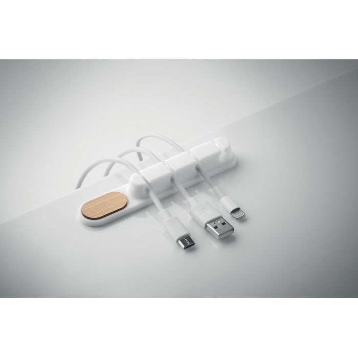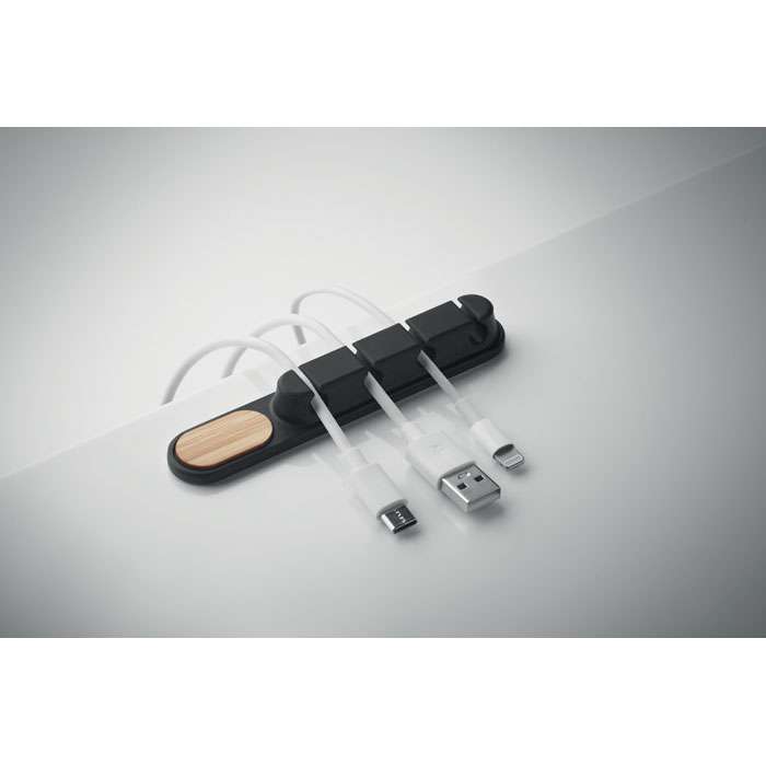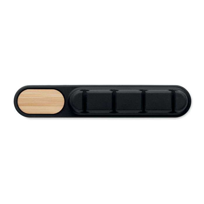 Kabelhållare i silikon med detaljer i naturlig bambu. Kompakt oval design håller kablarna ordnade och säkra.