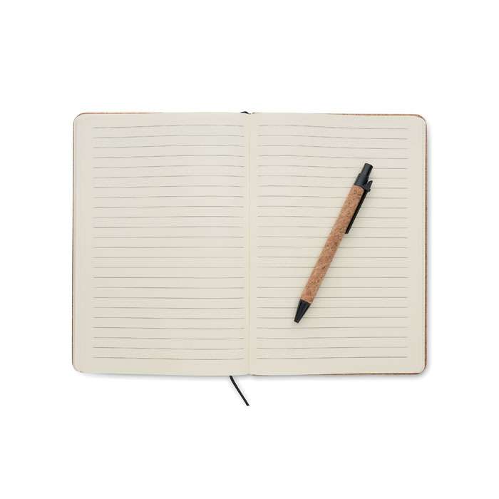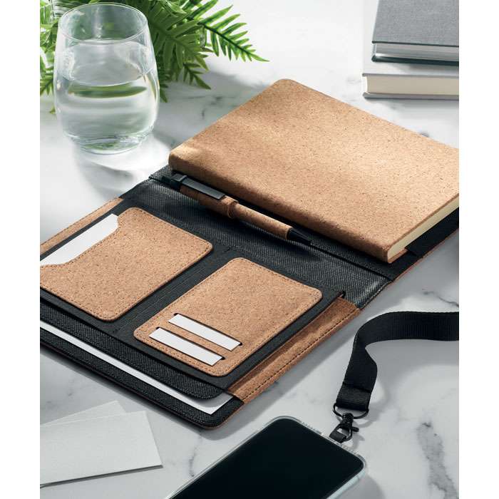 A5-portfölj i kork. Påfyllningsbar A5-anteckningsbok med omslag i hård kork. Inbundet. 192 linjerade sidor i återvunnet papper (96 ark). Matchande penna och pennhållare. 2 korthållare och ett stort fack. Elastiskt förslutningsband.