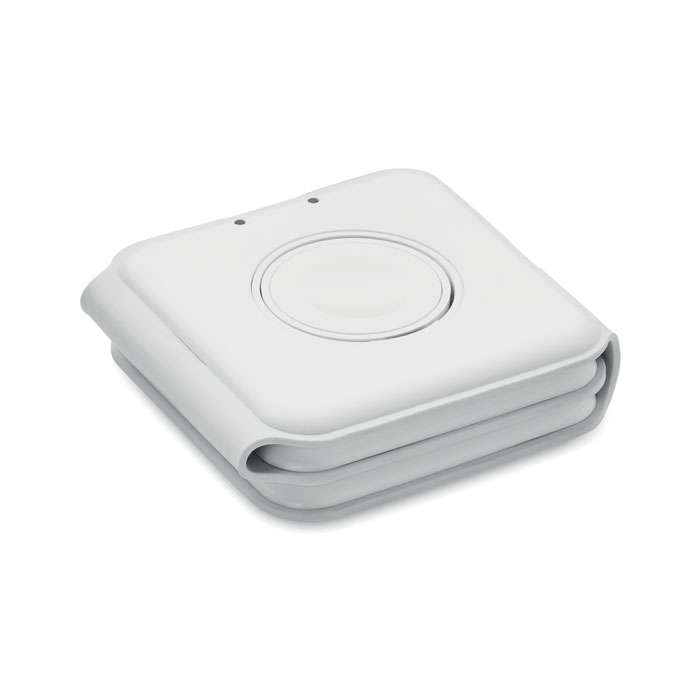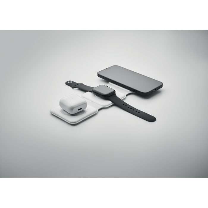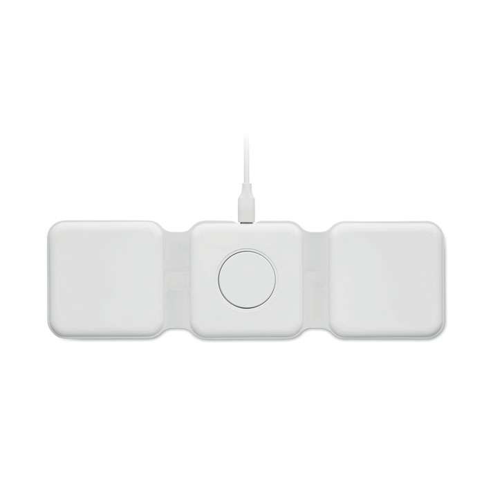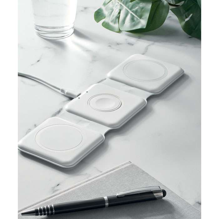3 i 1 hopfällbar laddningsstation i ABS. Den har 3 trådlösa laddningspunkter. Ingång: 2-i-1 typ-C och typ-A. Kompatibel med alla QI-aktiverade enheter som senaste Android, iPhone® 8, X och nyare. Även kompatibel med iWatch.