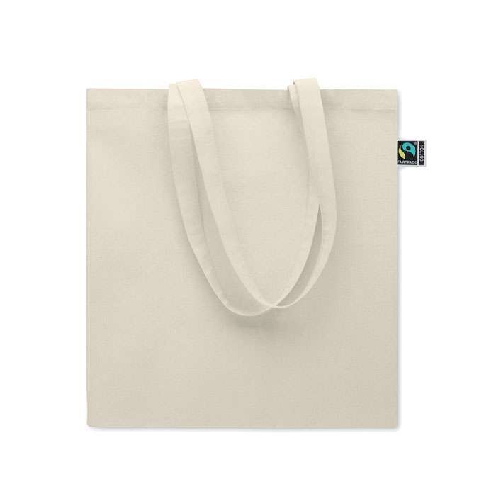 Kasse i Fairtrade-bomull med långa handtag och vikter. 180 gr/m². Denna produkt är certifierad enligt OEKO-TEX® STANDARD 100.