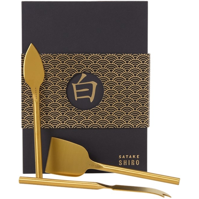 Satake Shiro Ostset Guld innehåller tre eleganta ostknivar i mässing med en exklusiv design som kombinerar japansk och nordisk stil. Perfekt som gåva till livsnjutare som vill servera ostar och snacks med klass och stil.