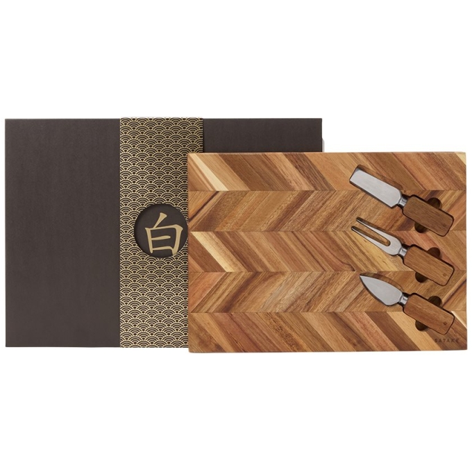 Satake Shiro ostset innehåller en stor skärbräda i akaciaträ med utfrästa hål för tre ostredskap: en kniv för hårdost, en spatel för krämiga ostar och en gaffel i rostfritt stål med akaciaträskaft. Perfekt gåva för den som vill servera ostar och snacks med klass och stil.