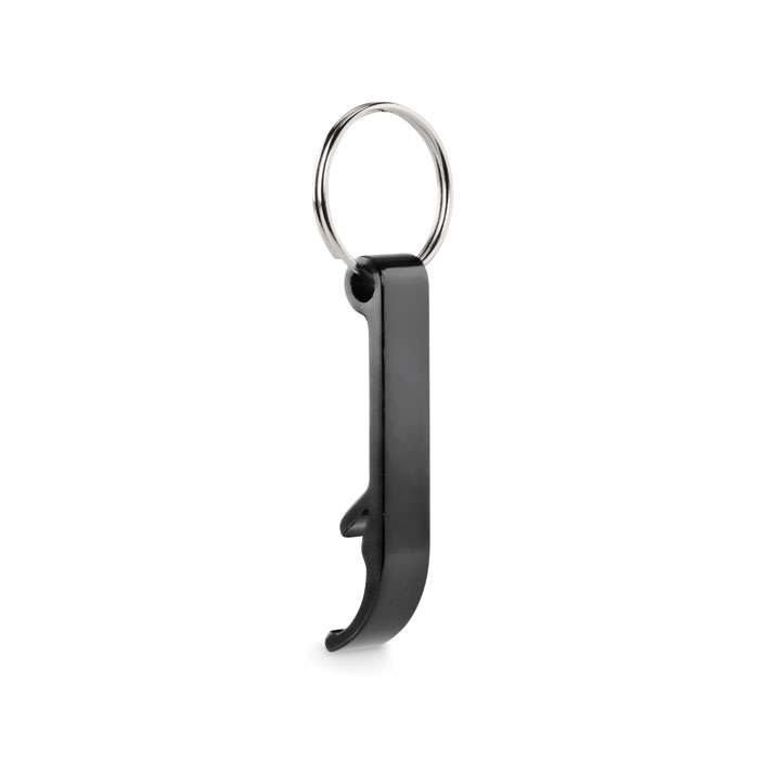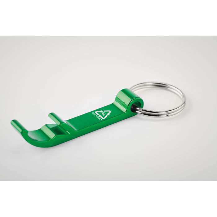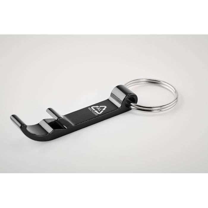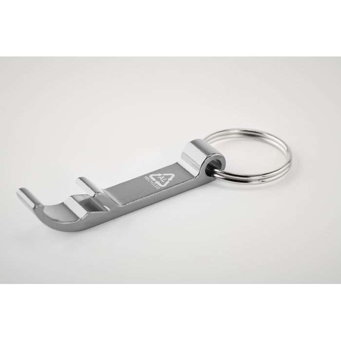 Nyckelring med flasköppnare i återvunnen aluminium i blank finish.
