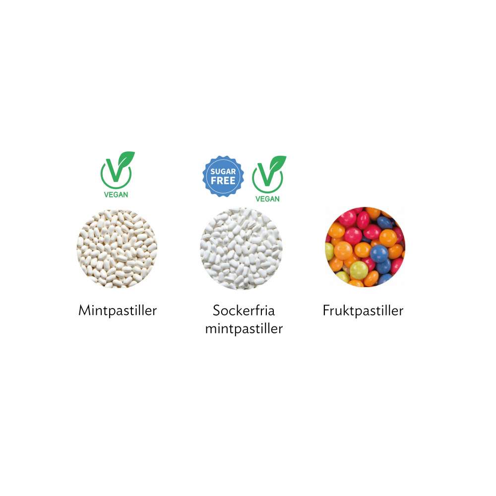 Rektangulär plåtburk fylld med välsmakande mint eller fruktpastiller. Burken finns i vitt eller silver och digitaltrycks.
