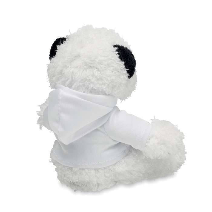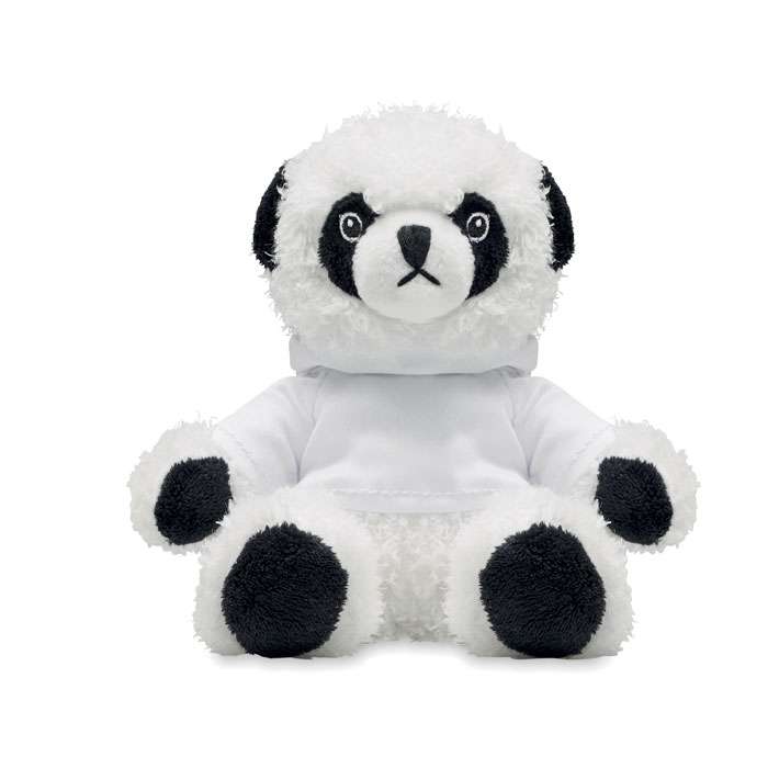 Pandabjörn i plysch som bär en tröja med huva. Rekommendera med sublimeringstryck.