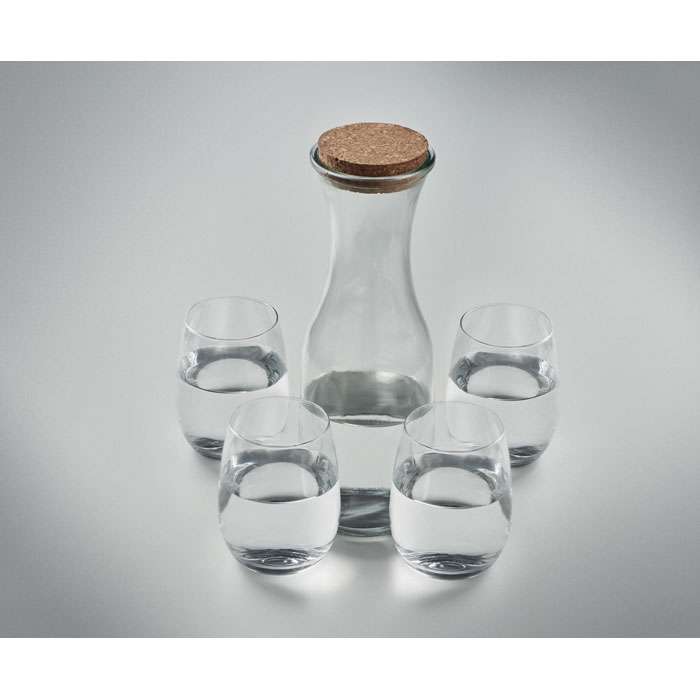 Karaffset i återvunnet glas. Innehåller: Innehåll: Karaff (1 liter) med korklock och 4st glas (420 ml).