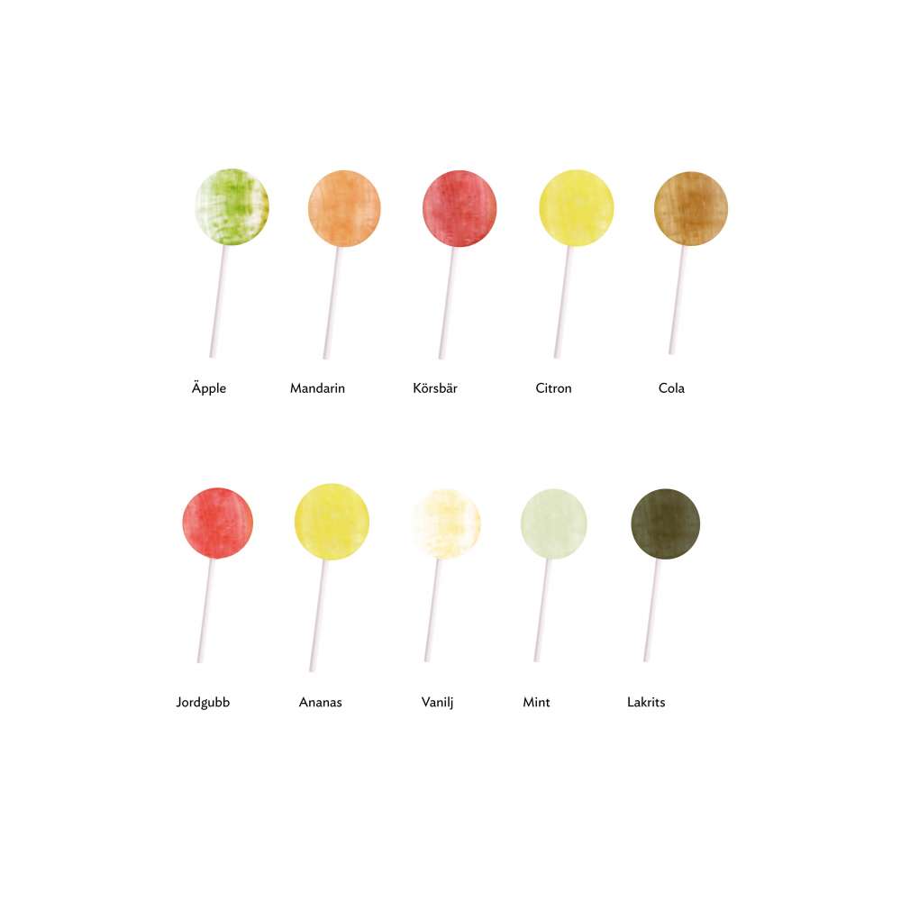 Platta klubbor i omslag med egen design. Tillgängliga smaker: Äpple, Mandarin, Körsbär, Citron, Cola, Jordgubb, Ananas, Vanilj, Mint eller Lakrits.
