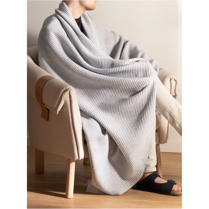 Plisserad fleecefilt tillverkad av en mjuk polyester – och viskosblandning. Den veckade strukturen på filten gör att den känns både fluffig och mjuk att svepa in sig i.