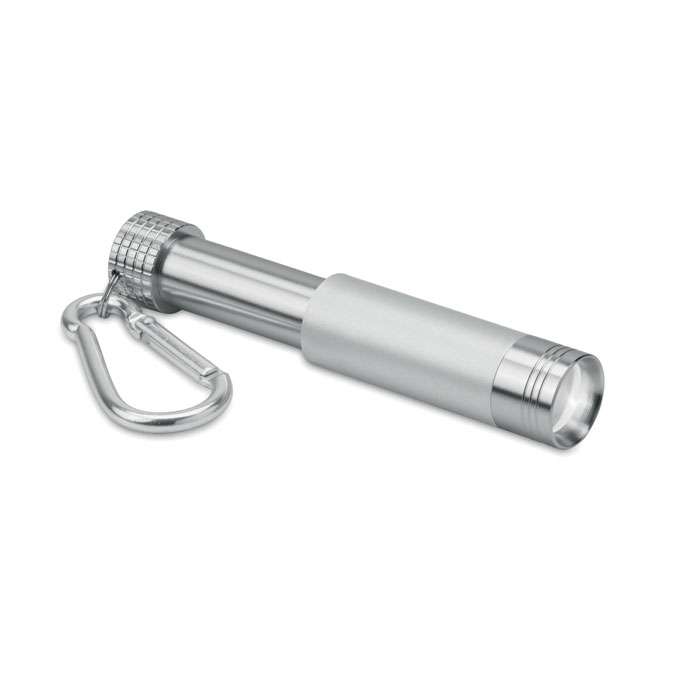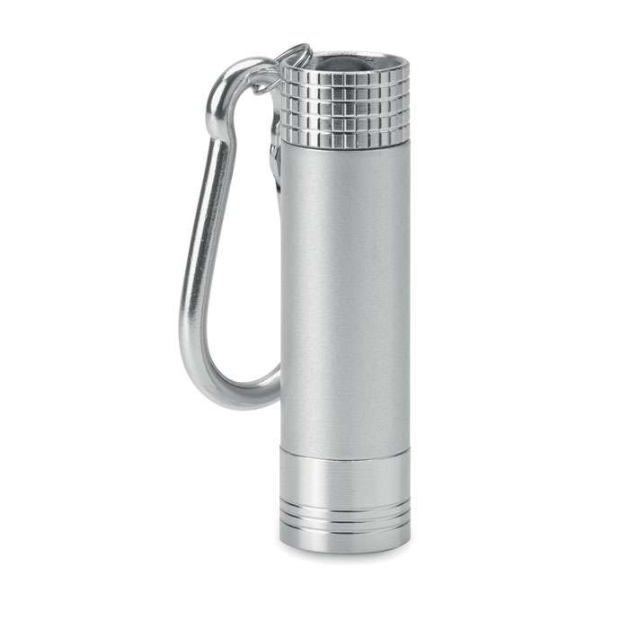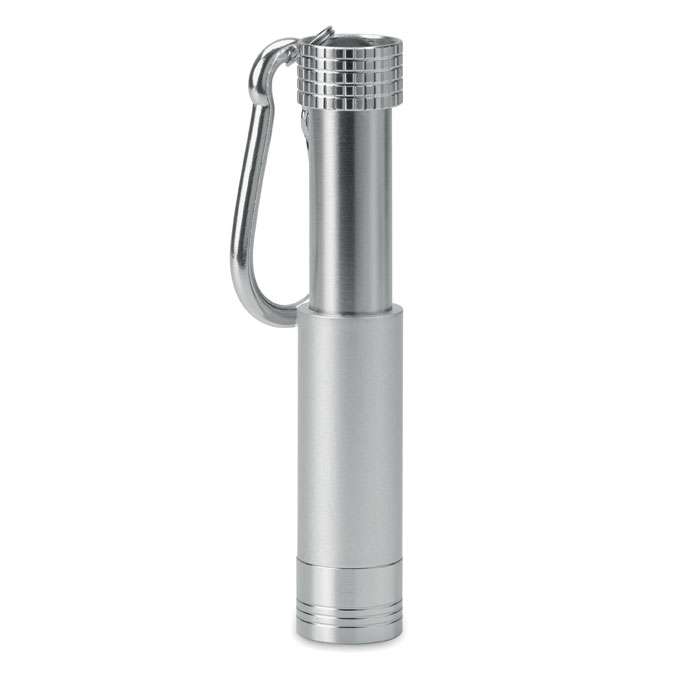 Mini LED ficklampa gjord som nyckelring i aluminium/ABS plast. Går att lasergravera så logon blir självlysande. 4 st LR44 batterier ingår.